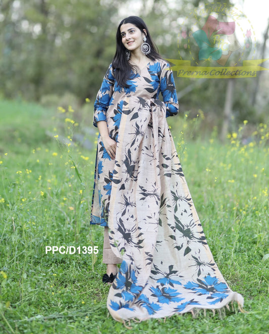Staple Twill Digital Print Suit Set with Hand Work and Ramie Chinon Dupatta for Women