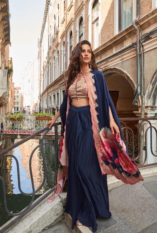 French Crepe Silk Jacket Blouse Dhoti Set with Handwork for Wedding Wear