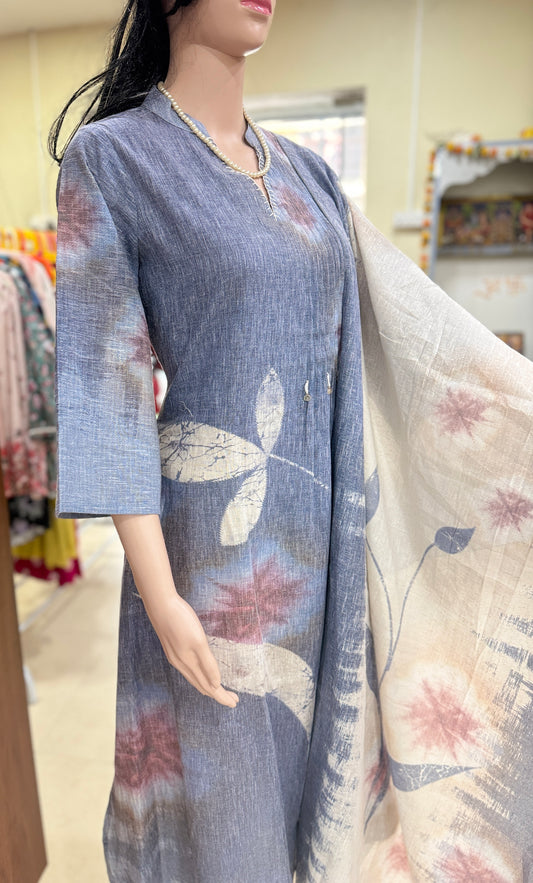 Staple Twill Digital Print Suit Set with Hand Work and Ramie Chinon Dupatta for Women