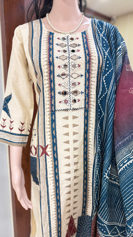 Linen silk kurta pant dupatta set for women with mirror and thread detailing, tribal print ethnic 3 piece set