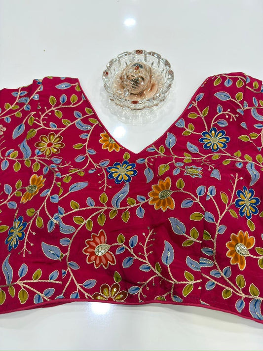 Pure silk embroidered readymade blouse for women, floral print, 3/4 sleeve, padded, size 38โ42, 15 inch length