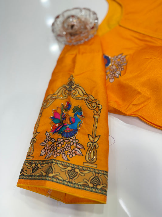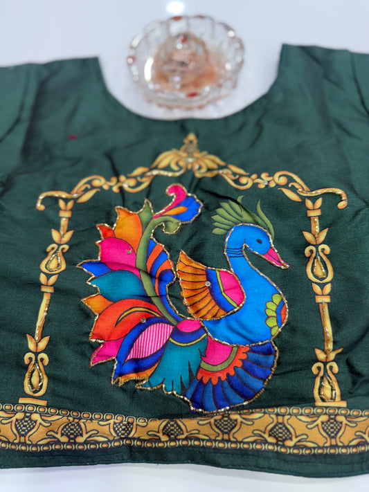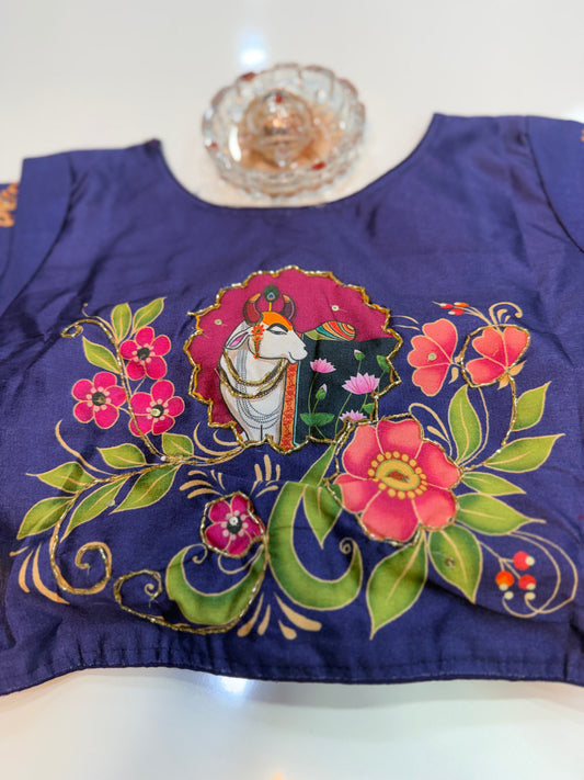Silk printed readymade blouse for women with antique handcrafted work, size 38โ42, short sleeve, saree blouse