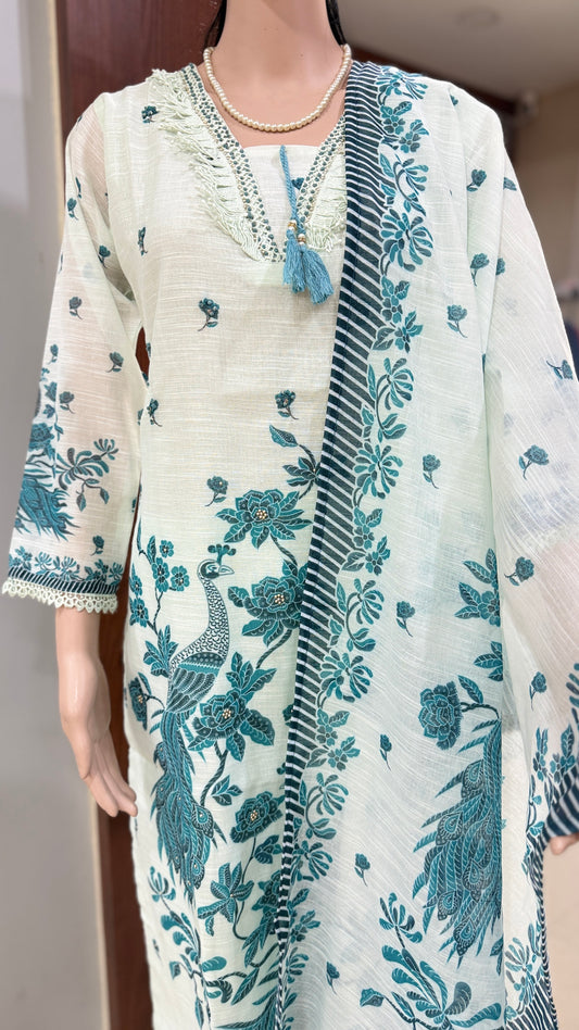 Embroidered linen kurta pant dupatta set for women with floral bird print, tassel neck, sizes 38 to 44