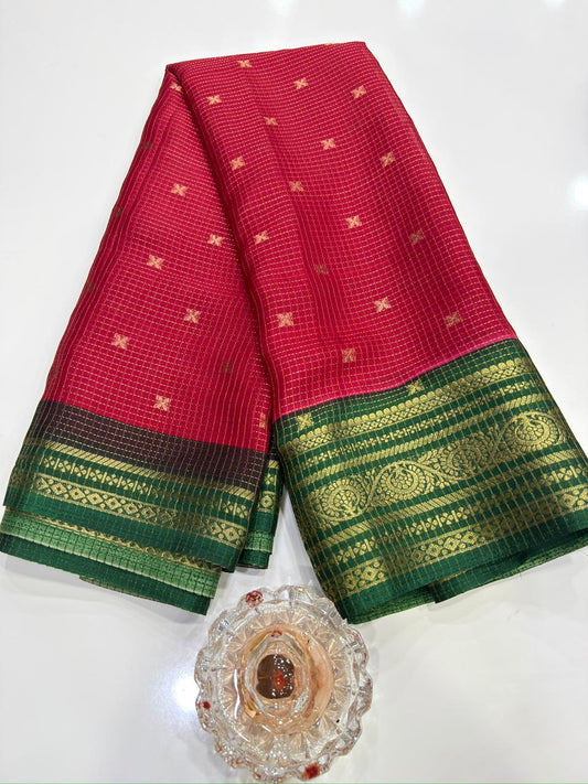 Munga pattu silk blend saree with small buti checks and zari border, womenβs festive wear saree