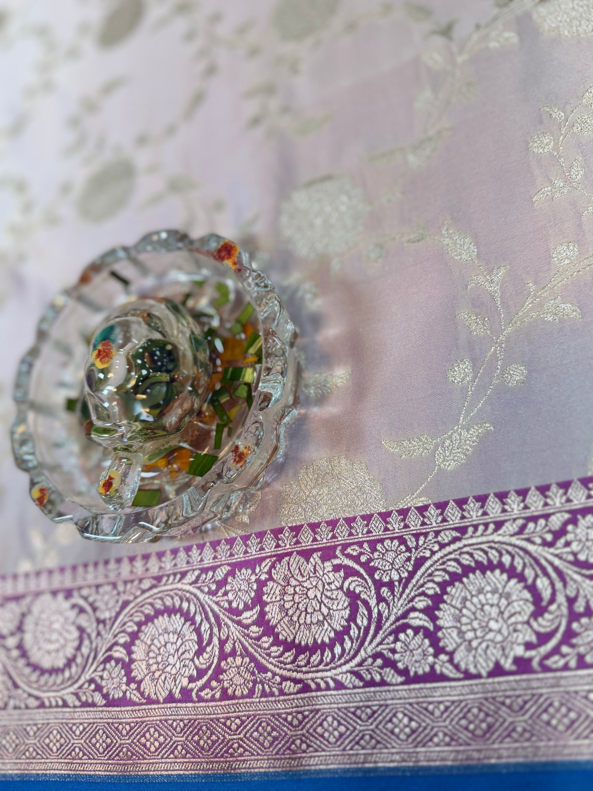 Banarasi Mashru Katan Silk Saree in Silver and Purple with Contrast Blouse Piece – Women’s Festive Wear