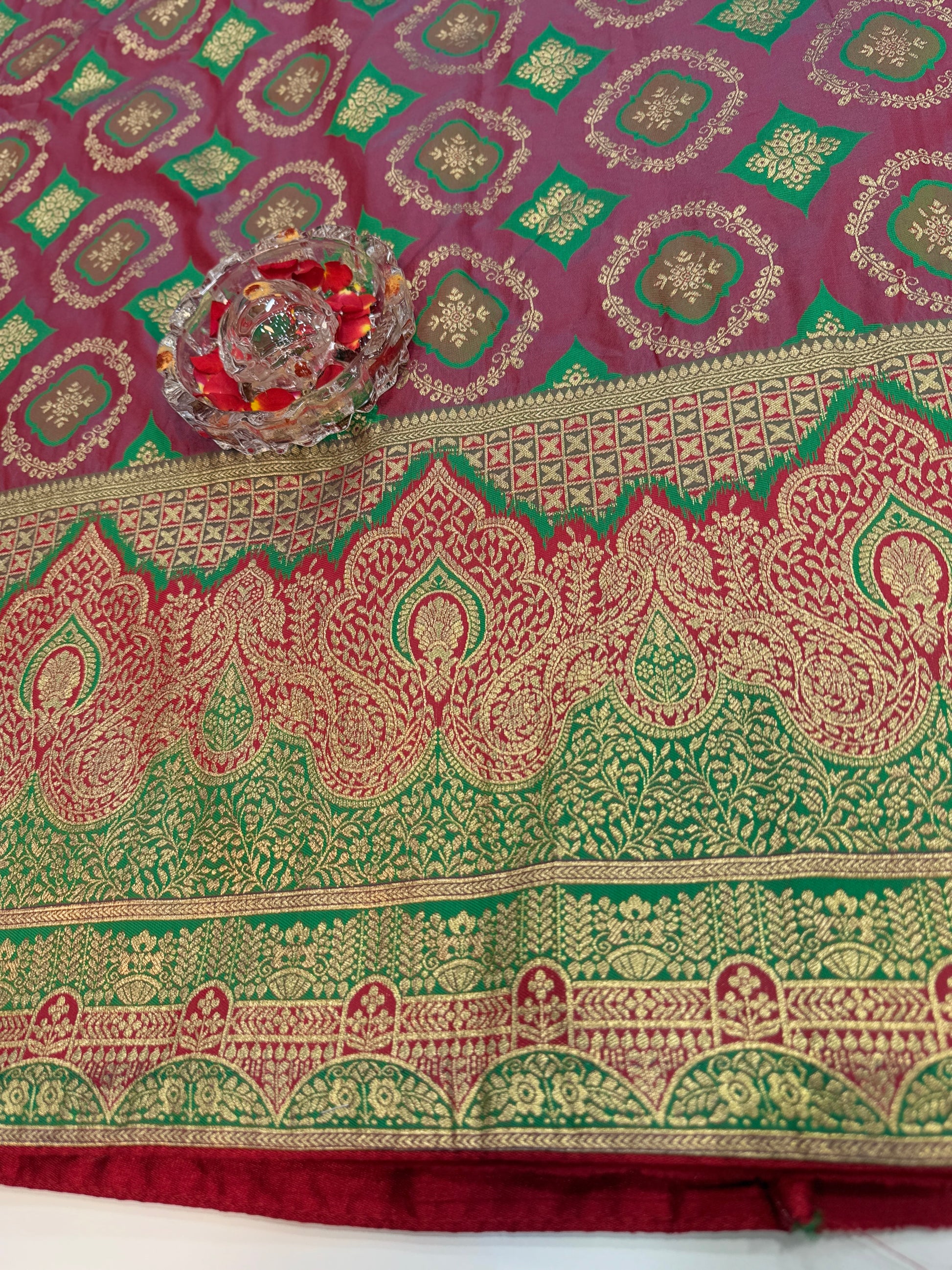 This elegant Banarasi saree is crafted with fine zari weaving, creating a luxurious texture and rich traditional look. The intricate detailing across the border and pallu adds a regal touch, perfect for weddings, festive functions, and grand celebrations.