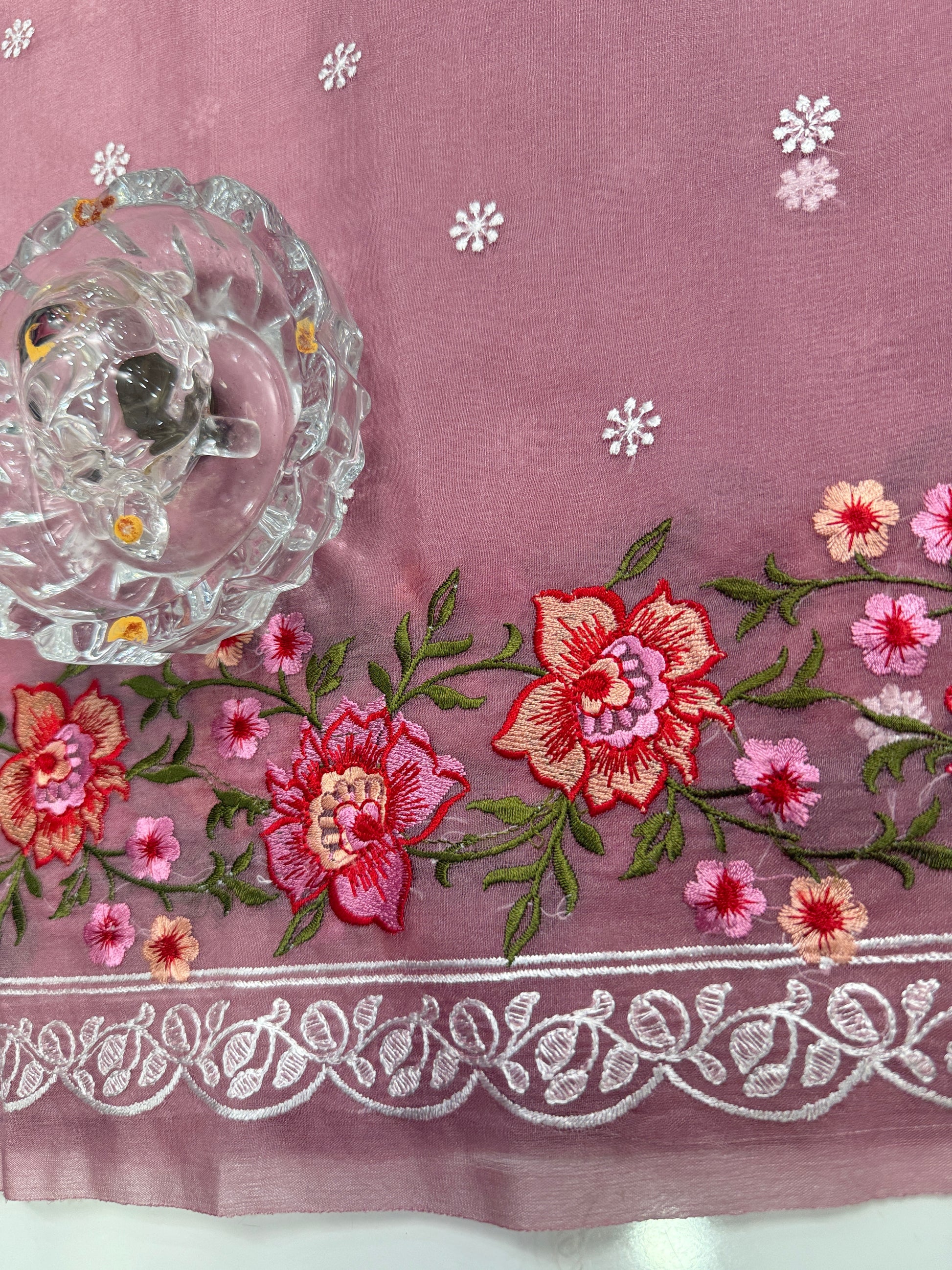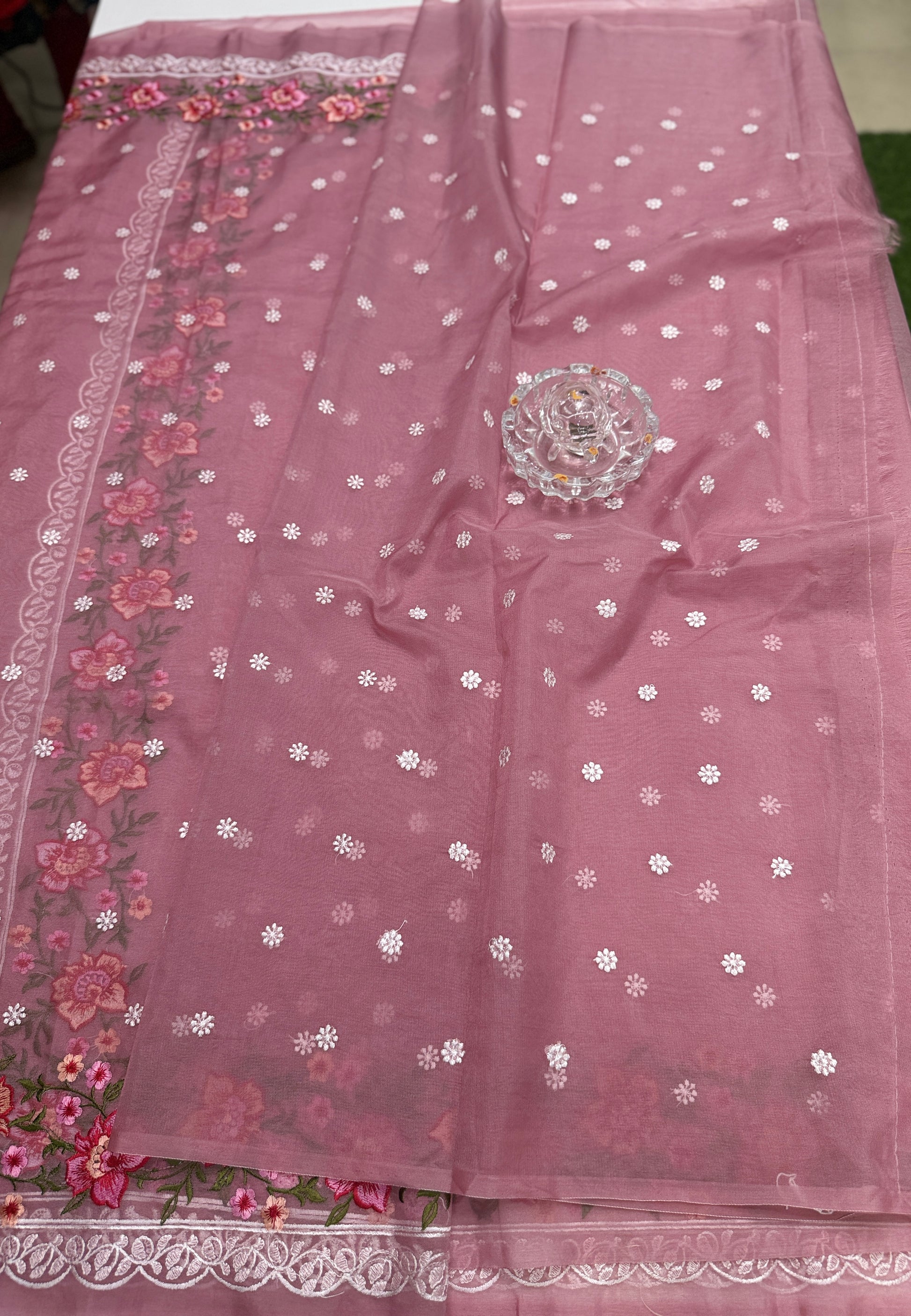 Available in vibrant yet subtle shades—rose pink, mint green, peach, and sunshine yellow—this collection reflects festive charm and timeless grace. The combination of detailed border design and airy organza base gives it an ethereal, dreamy look perfect for both daytime and evening occasions.