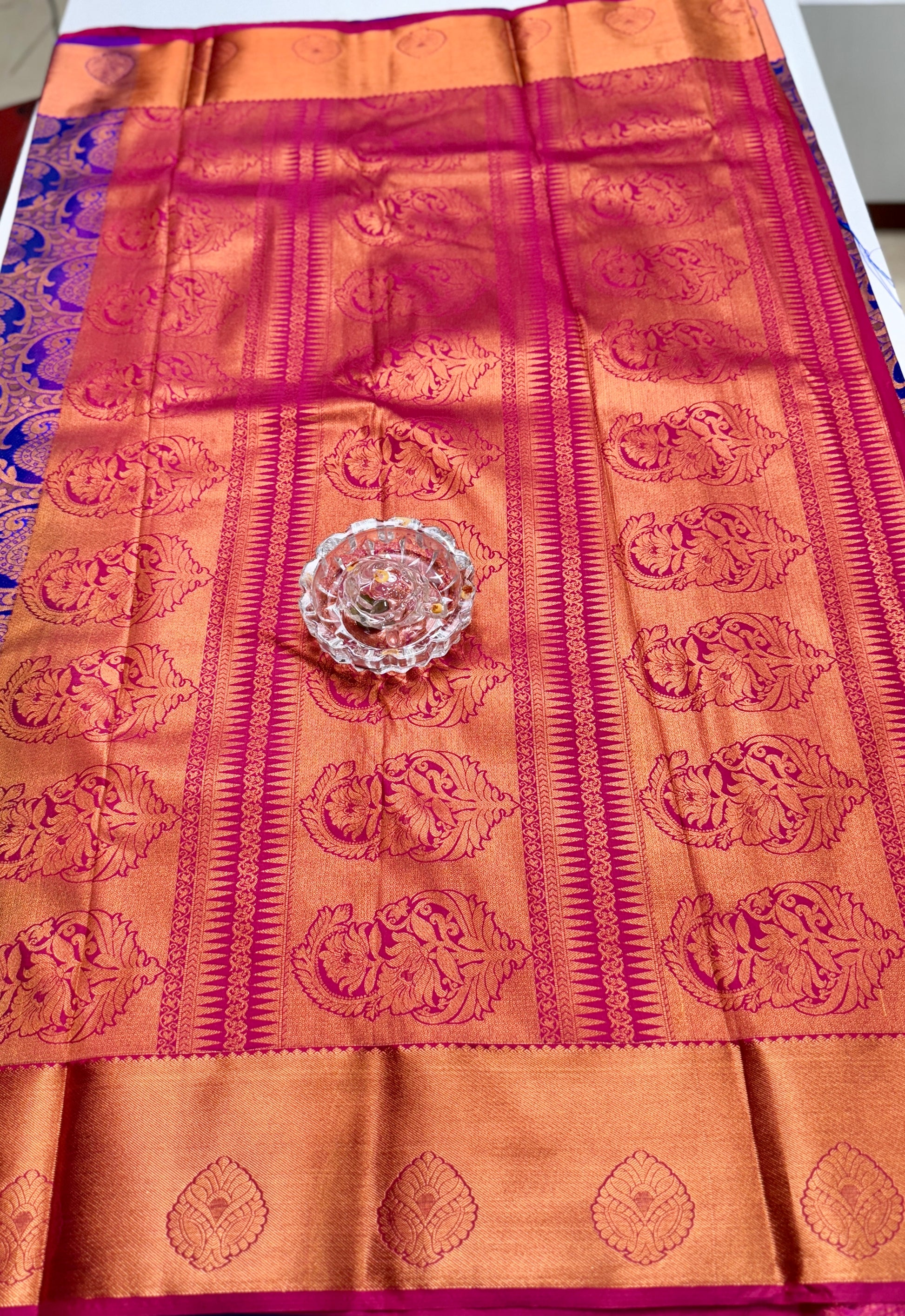 • Design: Traditional Kanchipuram-style with woven motifs and broad borders