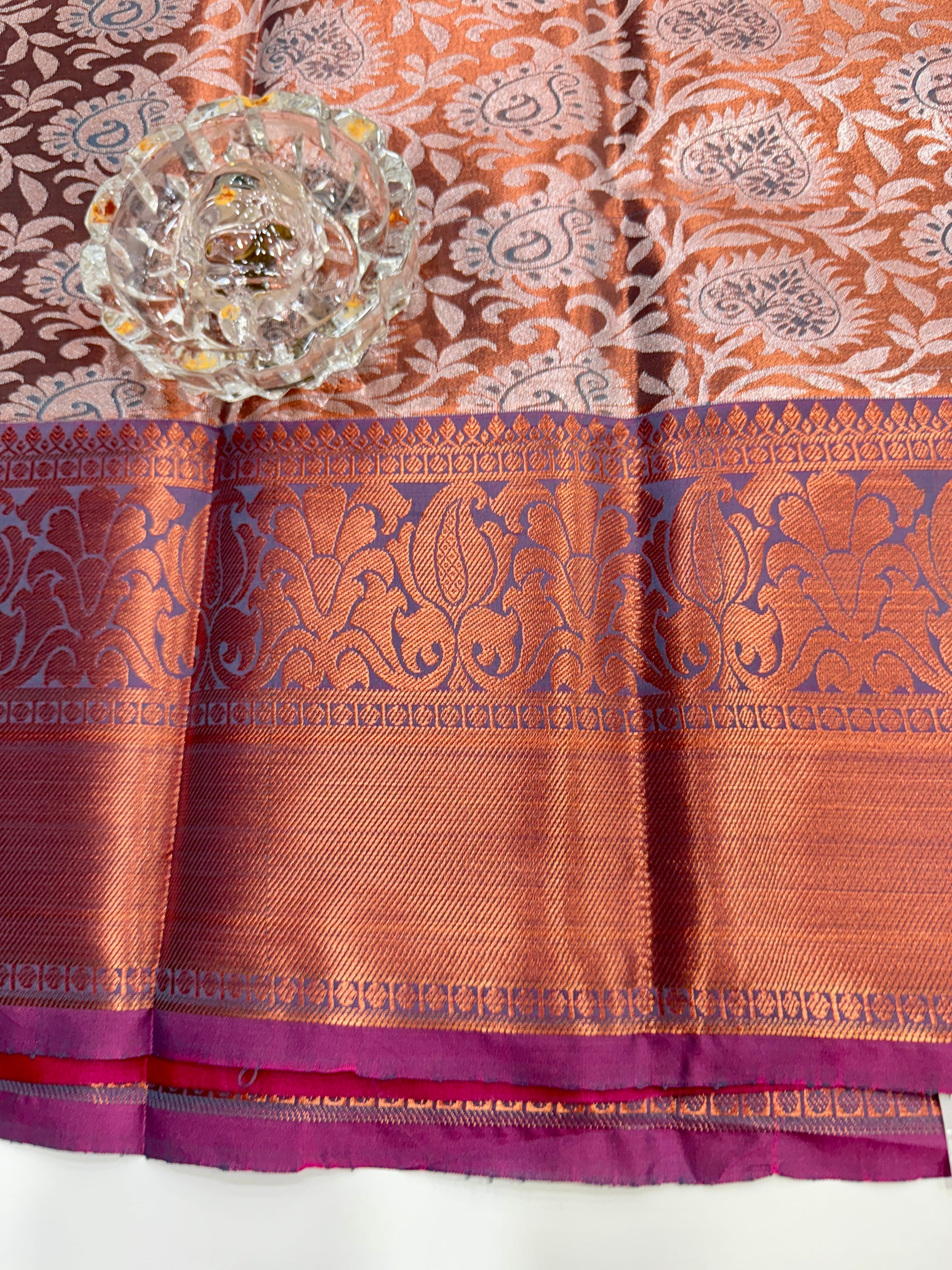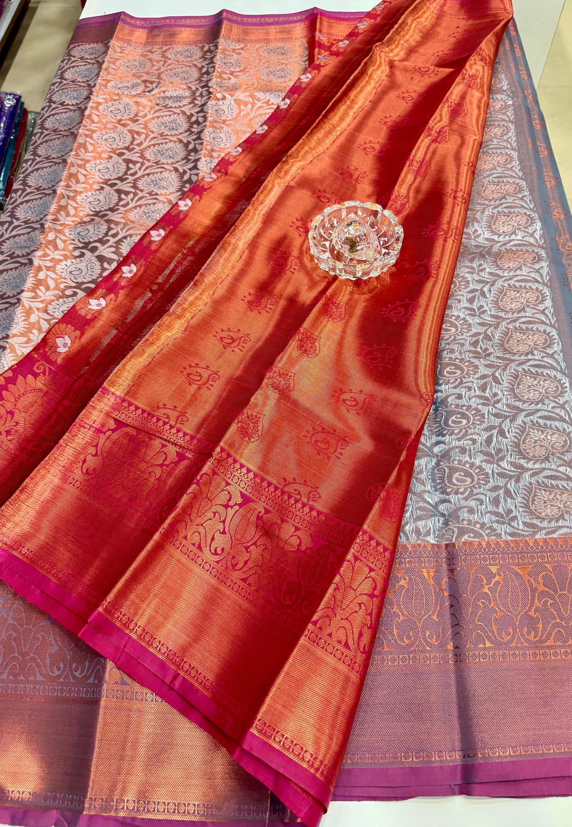 Bridal tissue saree for women with woven zari work and contrast border, kanchipuram style powerloom saree with blouse fabric