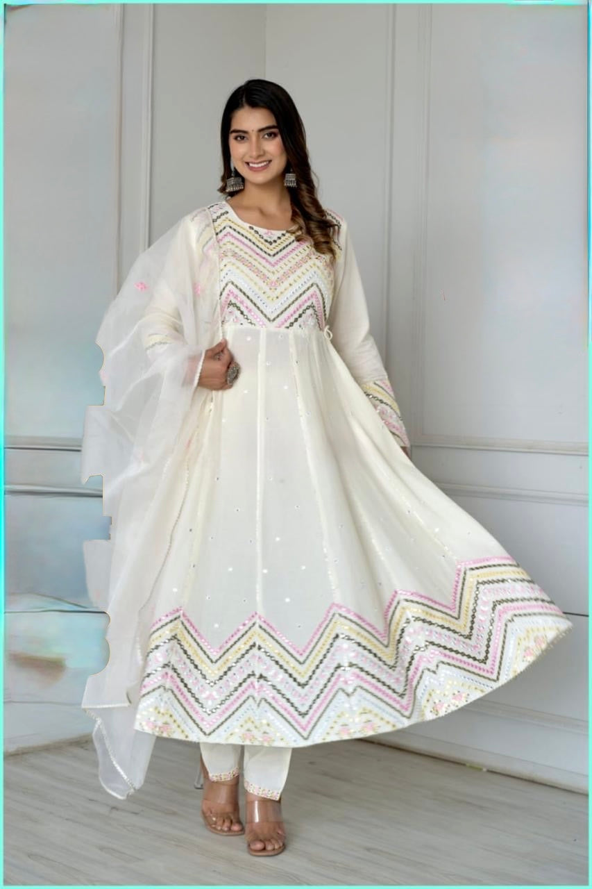 Full-Flared Anarkali Kurta Pant Dupatta Set with Thread and Mirror Work – Sizes 38 to 46