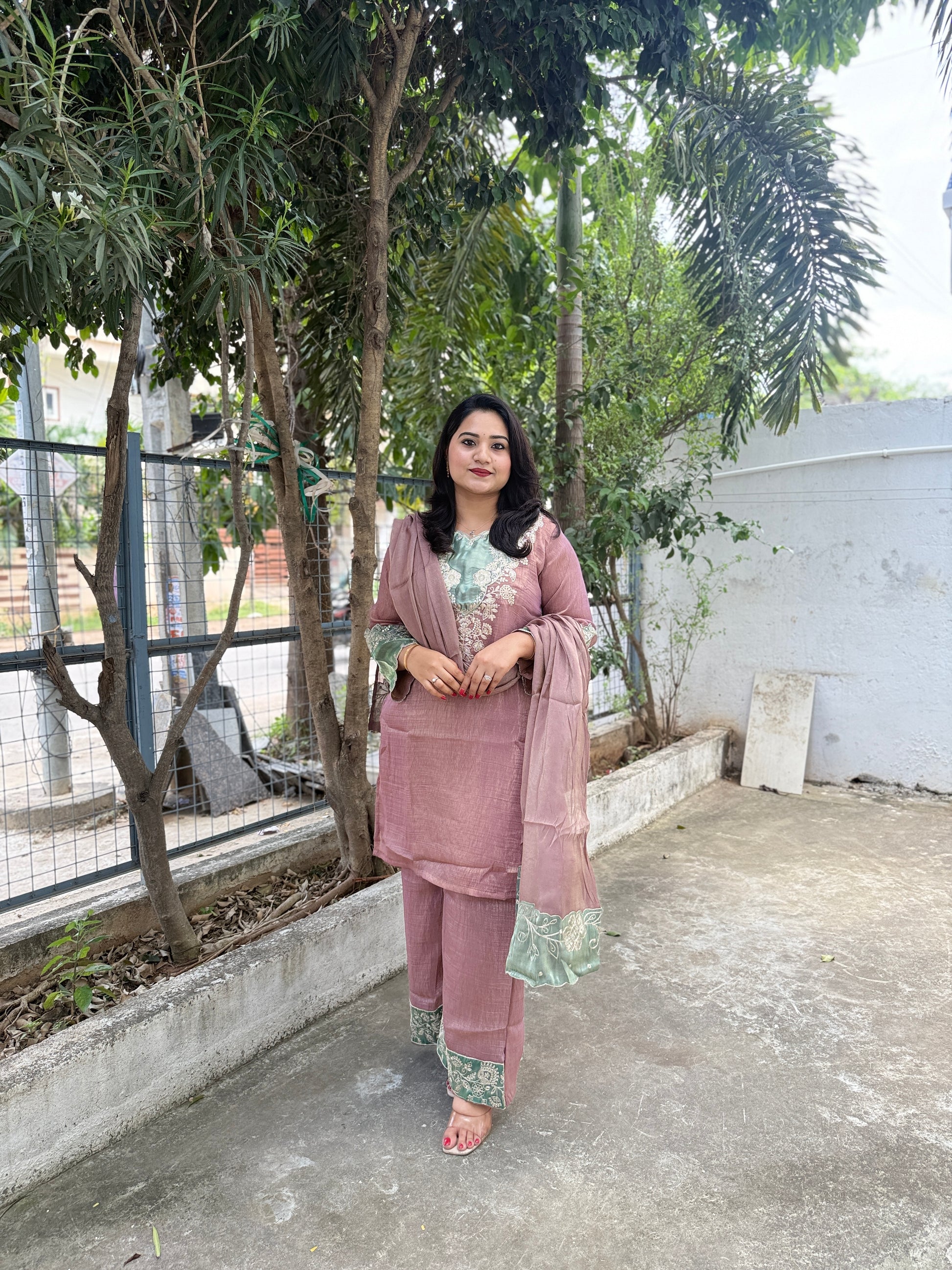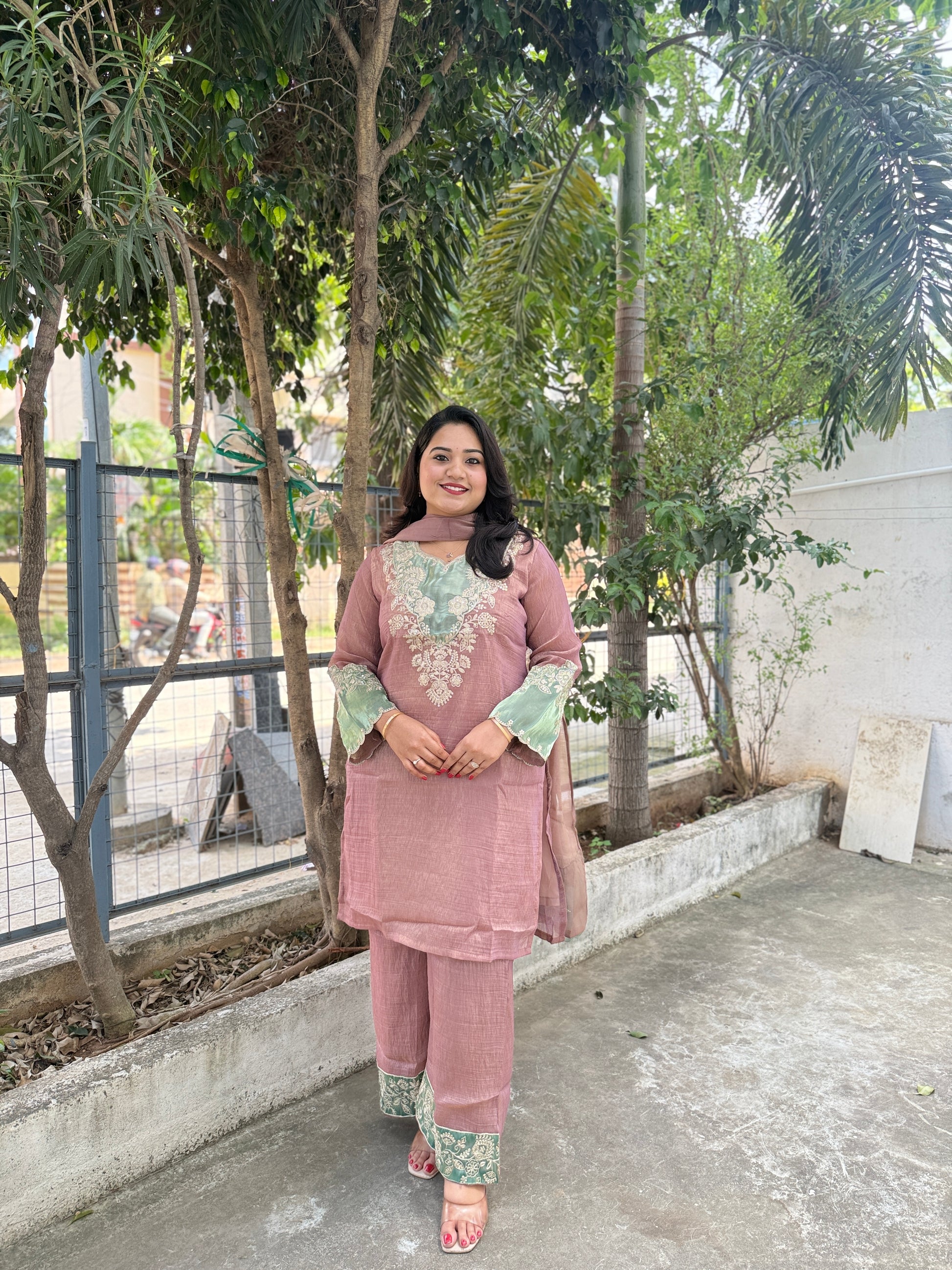 This elegant women’s three-piece ethnic set is crafted from premium crush tissue fabric, offering a lightweight texture with a graceful drape. The kurta is highlighted with delicate detailing work that enhances its festive appeal, while the coordinated palazzo and dupatta complete the ensemble for a balanced ethnic look. Fully stitched and available in sizes 38, 40, 42, and 44, this set is ideal for festive occasions, cultural gatherings, weddings, or evening celebrations. Its versatile silhouette allows for both traditional and contemporary styling, making it a timeless addition to your wardrobe.