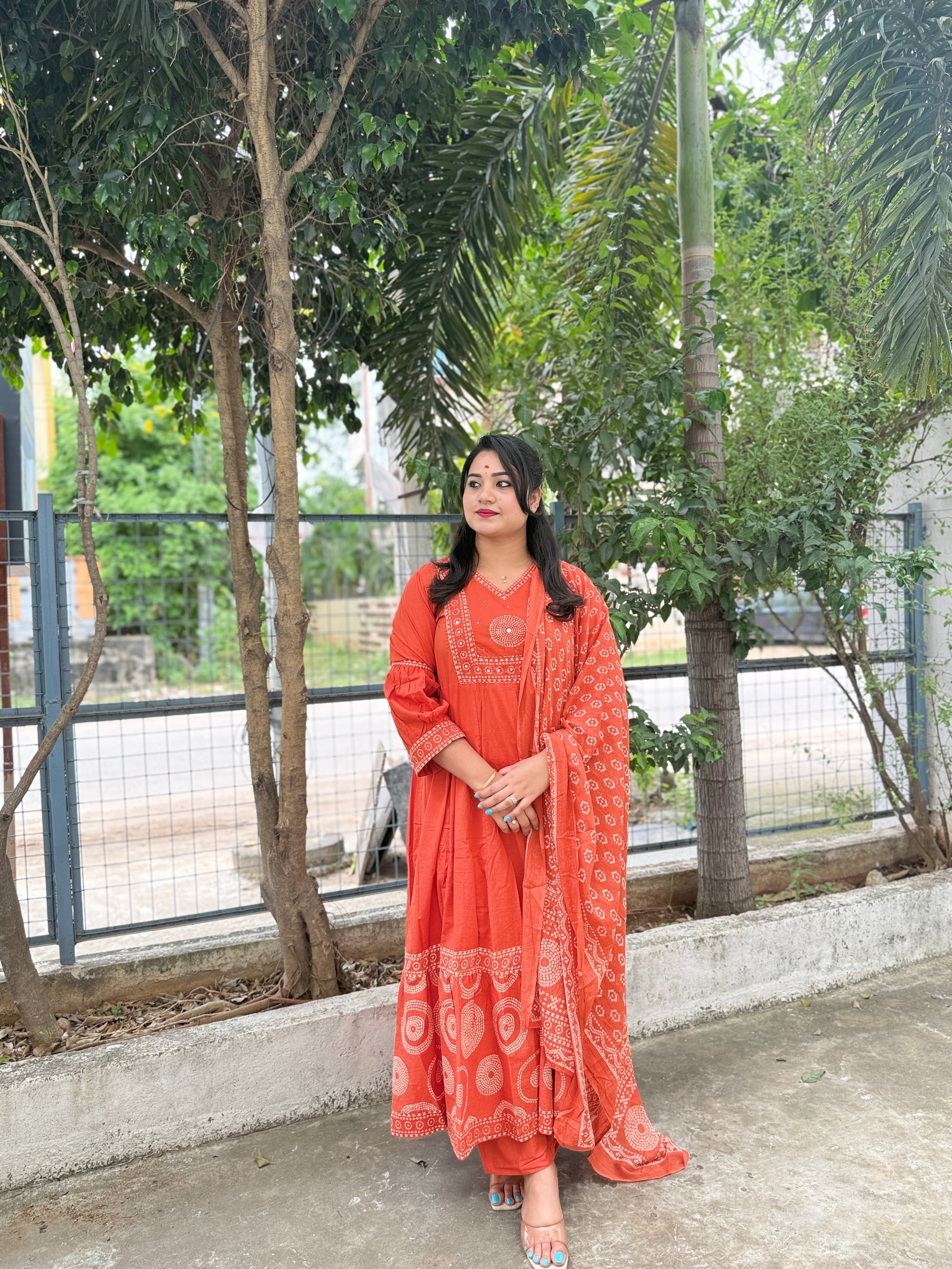 Elevate your ethnic wardrobe with this effortlessly stylish rust-colored cotton 3-piece set, featuring hand-touched mirror and sequin work on a beautifully printed kurta. The flowy silhouette paired with a matching pant and printed cotton dupatta makes it a graceful pick for festive gatherings or casual celebrations.