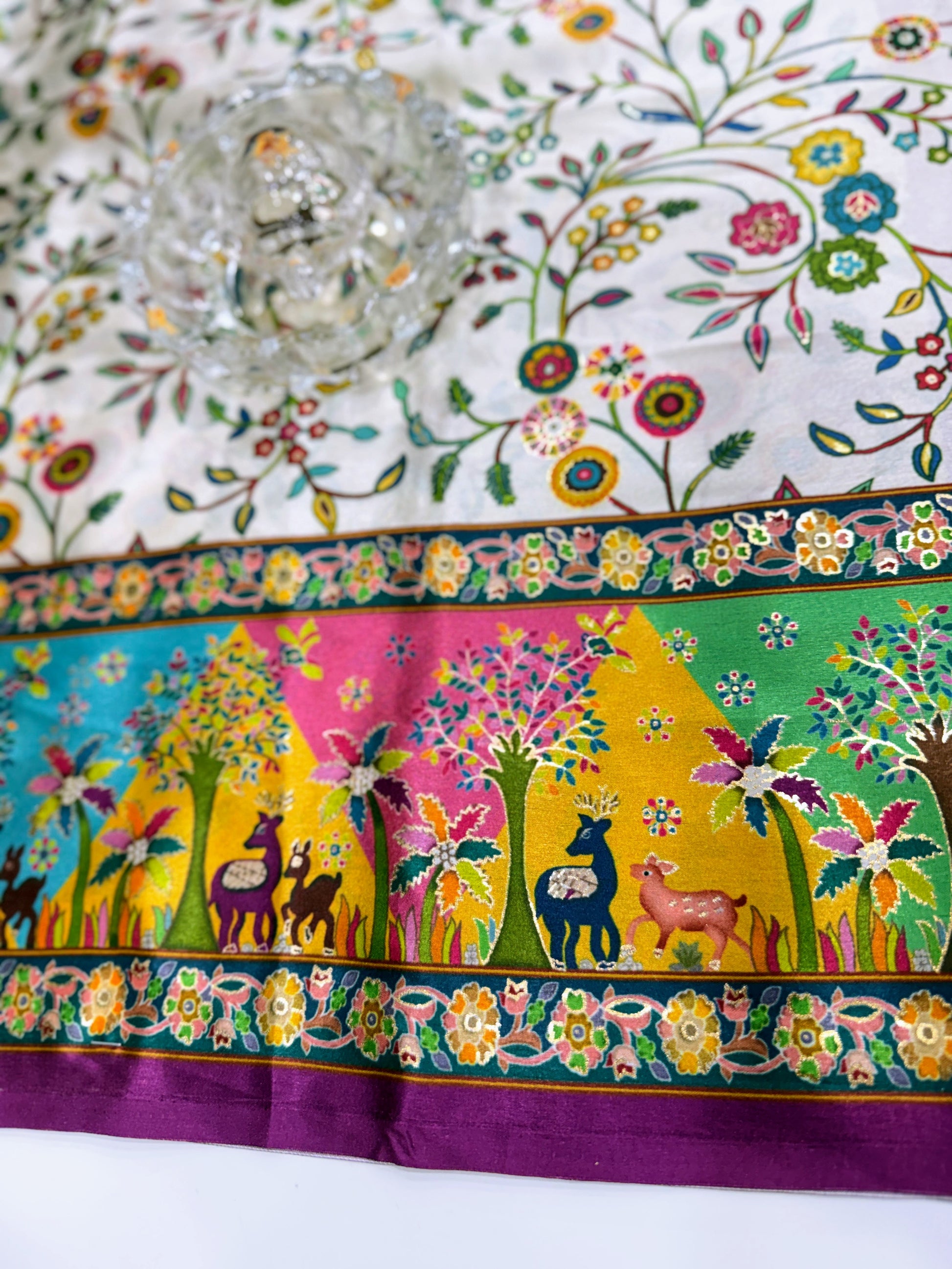 Each saree carries a vibrant illustrated panel placed strategically on the pallu area, creating a statement look when draped. The upper drape and pleats display subtle geometric or textured prints that balance the bold artwork, enhancing wearability while keeping the design visually rich. The fabric is lightweight, comfortable, and easy to pleat, making it suitable for long hours of wear without losing structure.