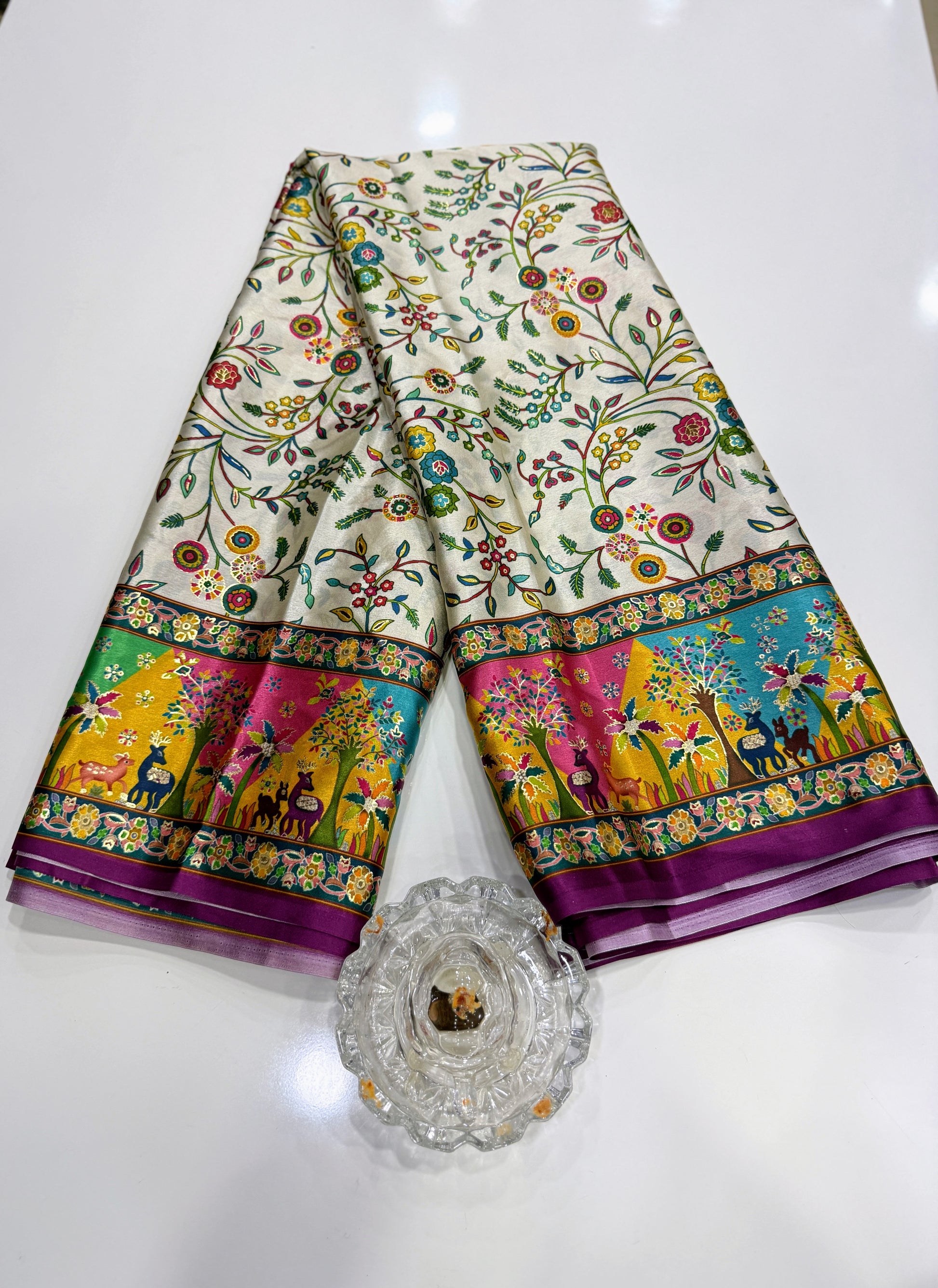 This Japan satin saree features high-resolution position printing across the pallu and lower drape, designed to showcase bold artistic themes such as abstract florals, peacock motifs, contemporary graphics, animal artwork, and Ajrak-inspired detailing. The smooth satin fabric provides a soft, fluid fall, giving the saree an elegant glossy finish ideal for festive functions, casual gatherings, office events, and day-to-evening transitions.
