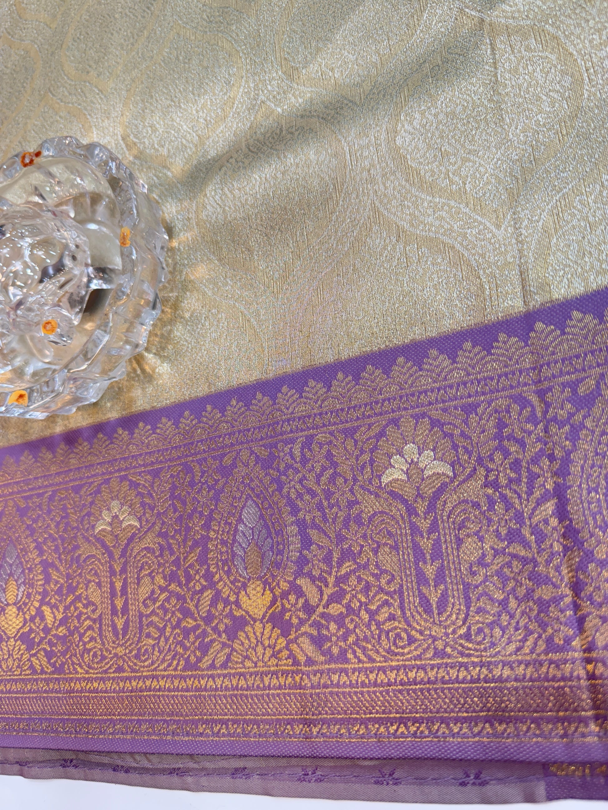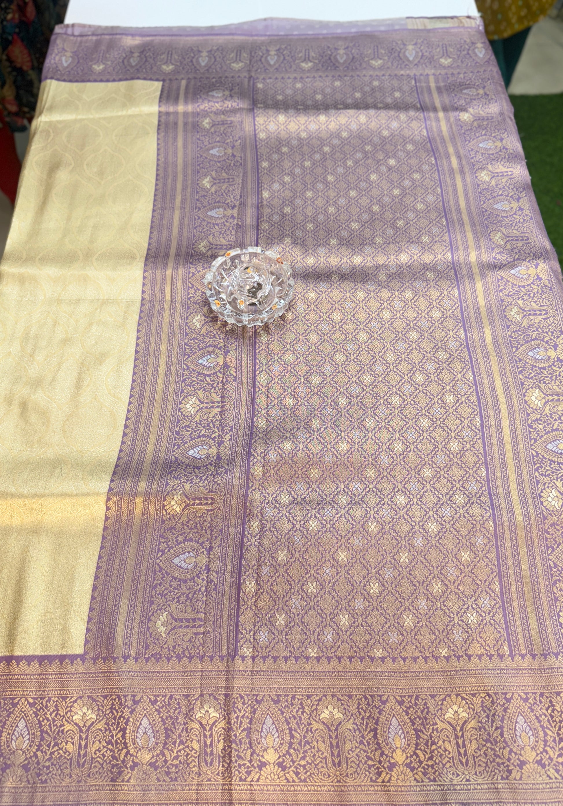 Kanjivaram soft silk with the artistry of Meenakari weaving. Each saree is crafted with fine zari and thread detailing, broad pattu borders, and an ornate rich pallu that captures the essence of regal Indian tradition.