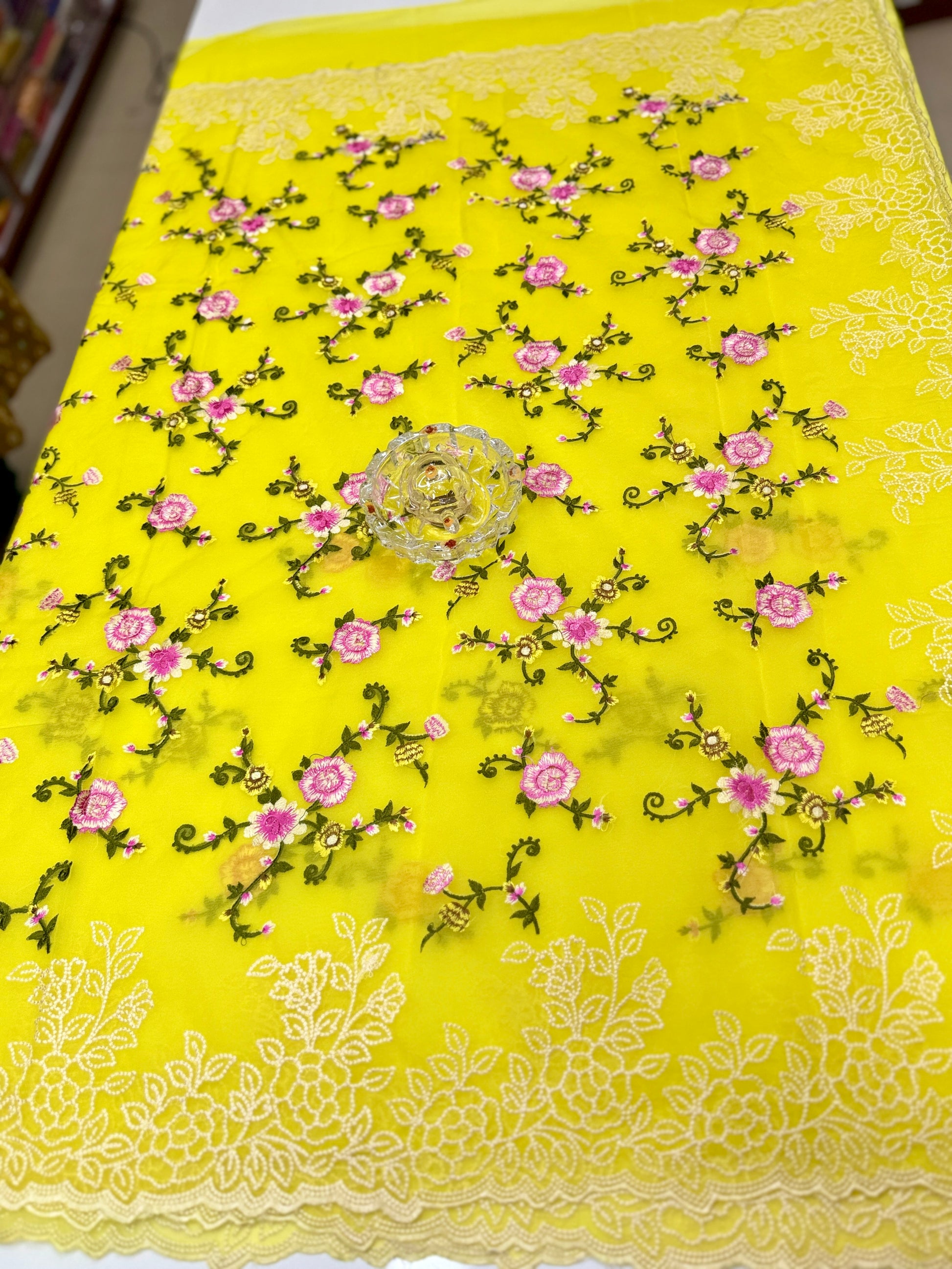 Work: Floral thread and resham embroidery with woven border