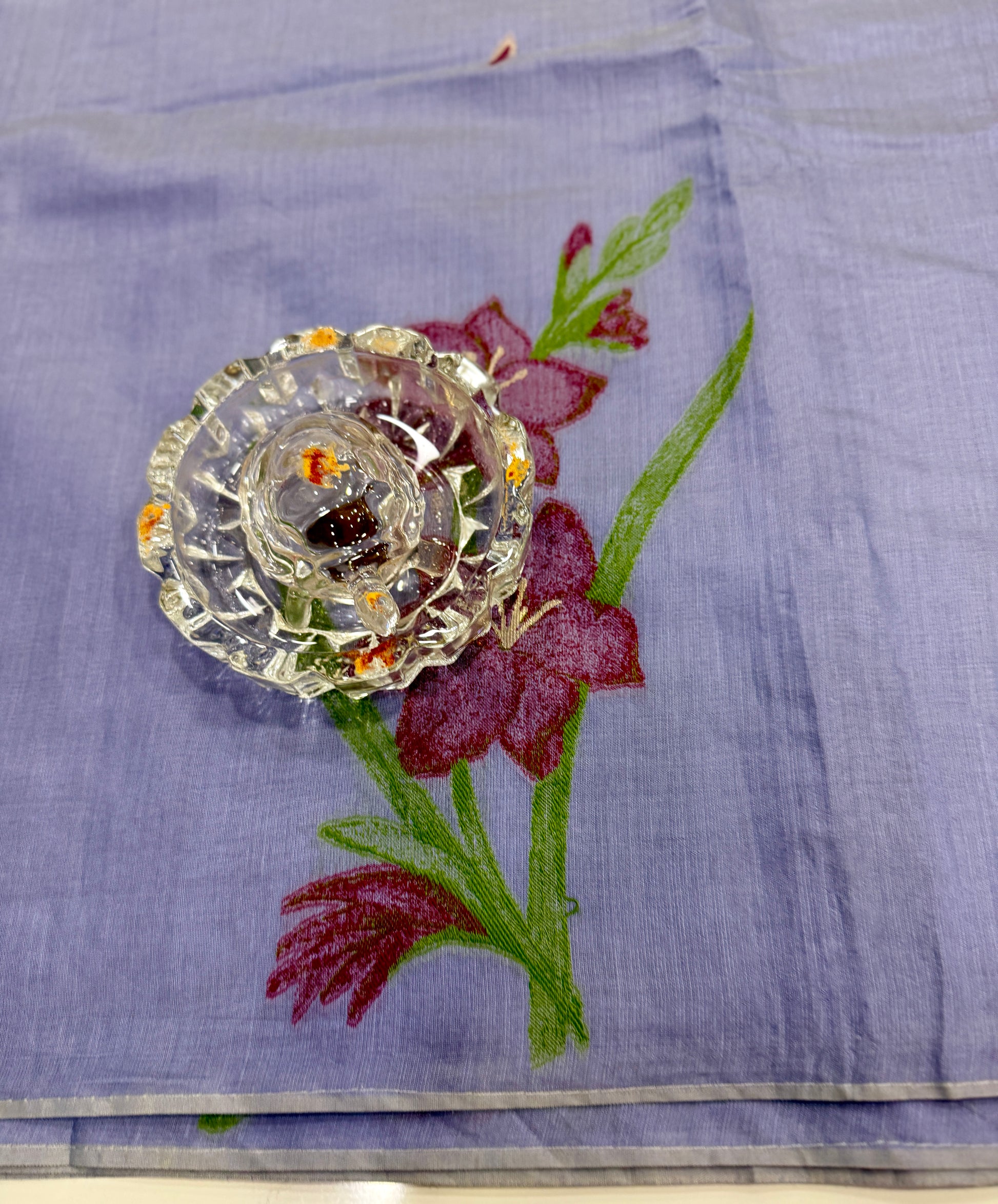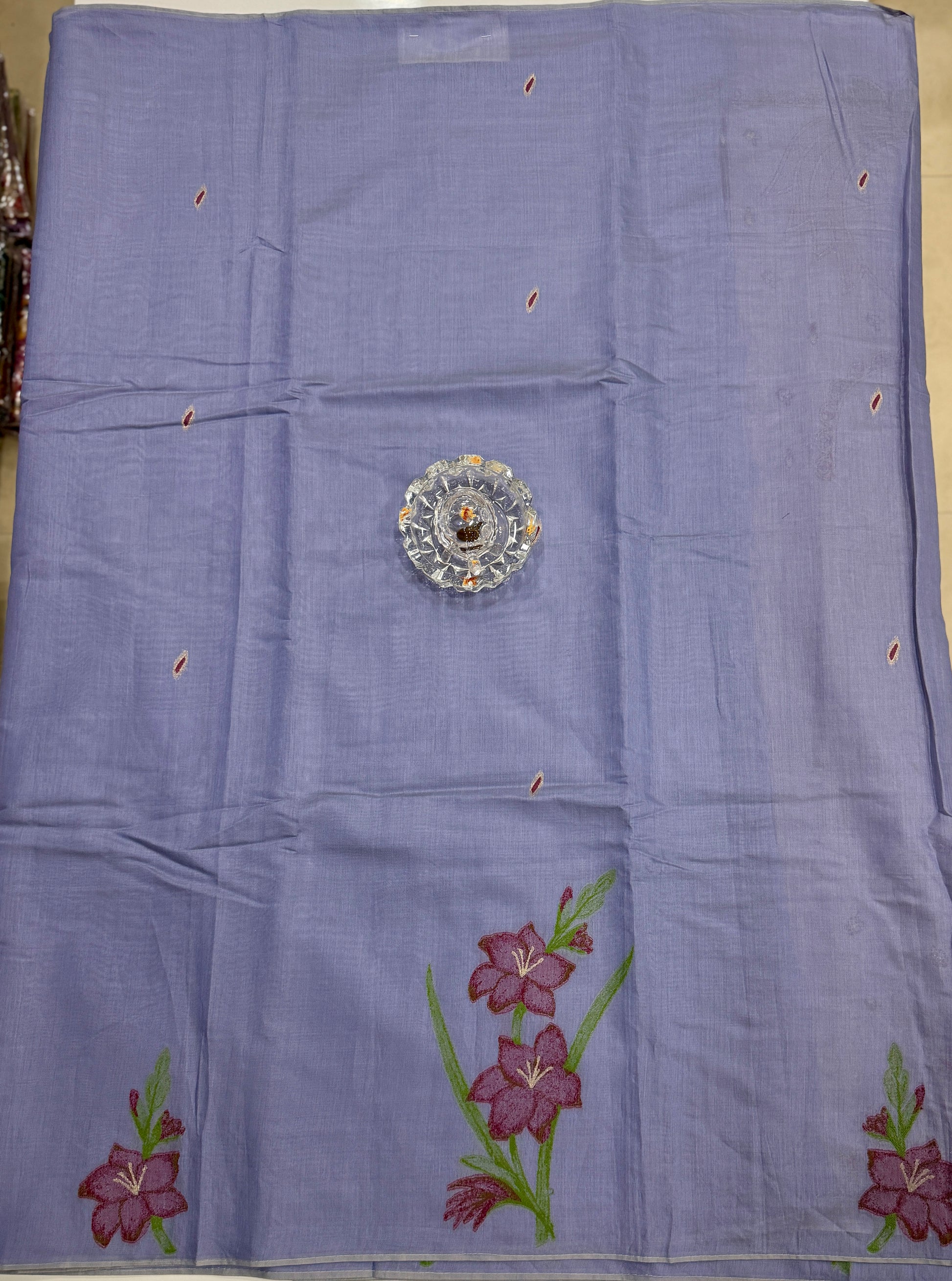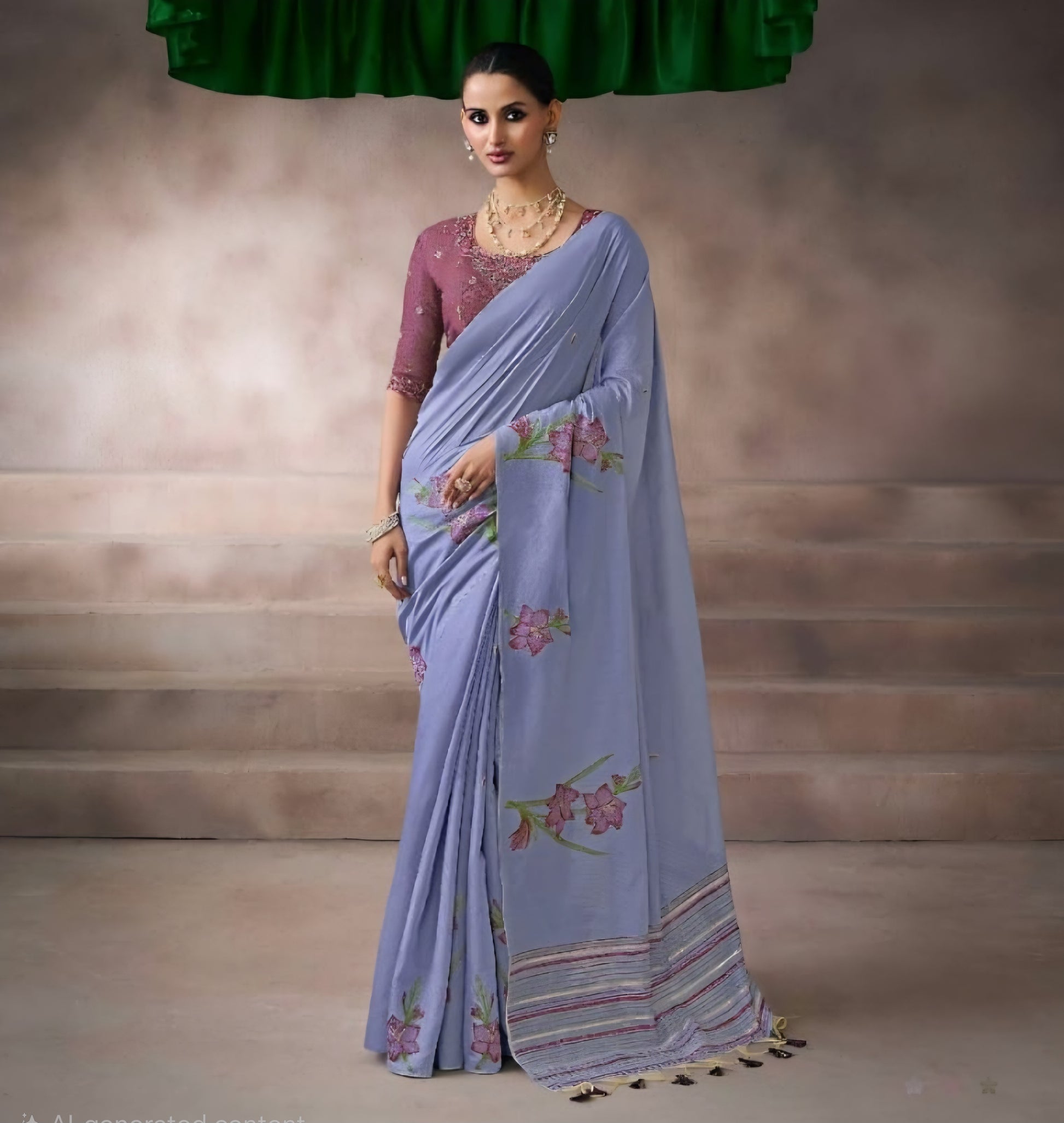 This lavender-blue saree is crafted from a viscose-cotton fabric designed to emulate the elegance of woven kora silk. The pastel tone is paired with minimally woven motifs that elevate the overall aesthetic. The lightweight drape and tasselled pallu make the saree comfortable for festive and semi-formal occasions.