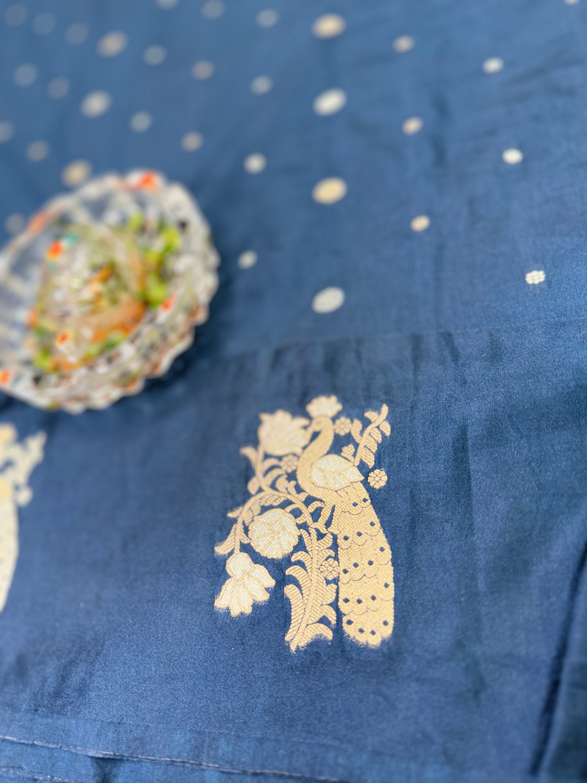 This Mashru silk saree with satin border is a graceful blend of sheen and tradition, designed to bring elegance to festive and cultural occasions. Woven with a glossy silk finish and adorned with bold zari motifs, these sarees stand out with their refined drape and timeless appeal. Available in maroon, red, navy blue, black, and cream, each saree comes with a matching blouse piece. The satin border enhances the look, offering a polished finish perfect for both daytime functions and evening wear. Sometimes also referred to as Mashroo, this textile is valued for its lustrous surface and smooth drape. Lightweight yet rich in appearance, Mashru sarees are ideal for weddings, family functions, and festive gatherings.