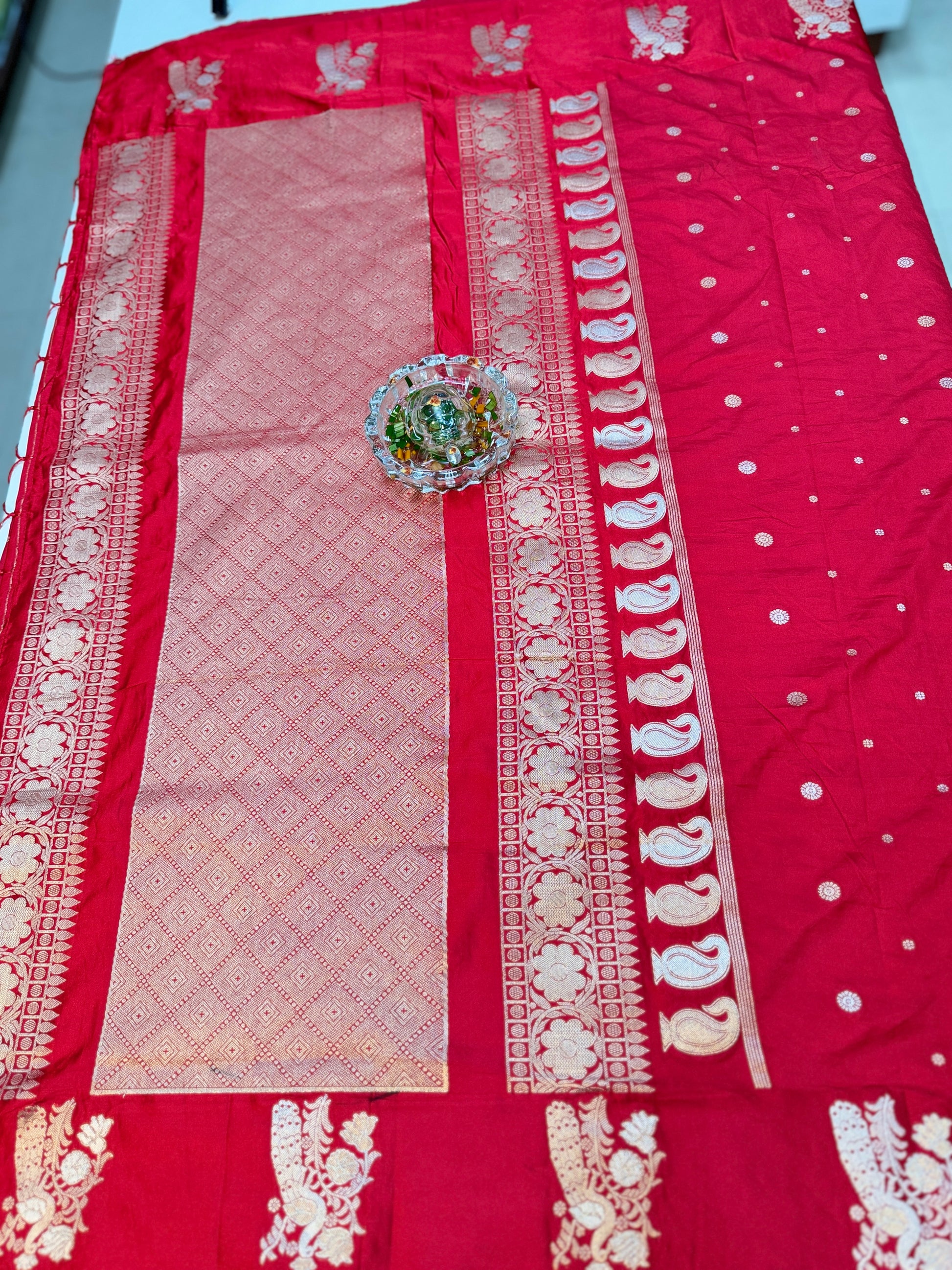Style & Texture: Glossy Mashru weave with soft satin border contrast