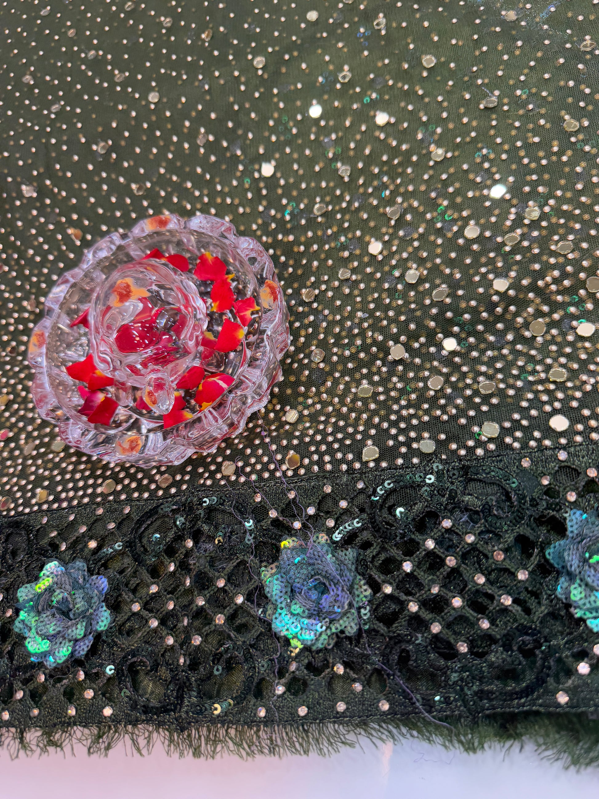 - Work: Heavy sequin and lace embroidery with floral applique border