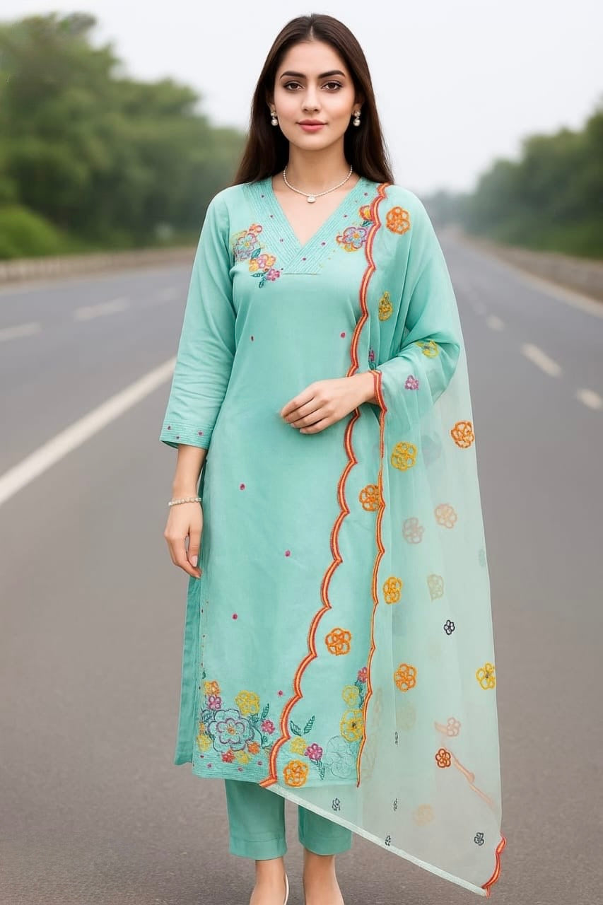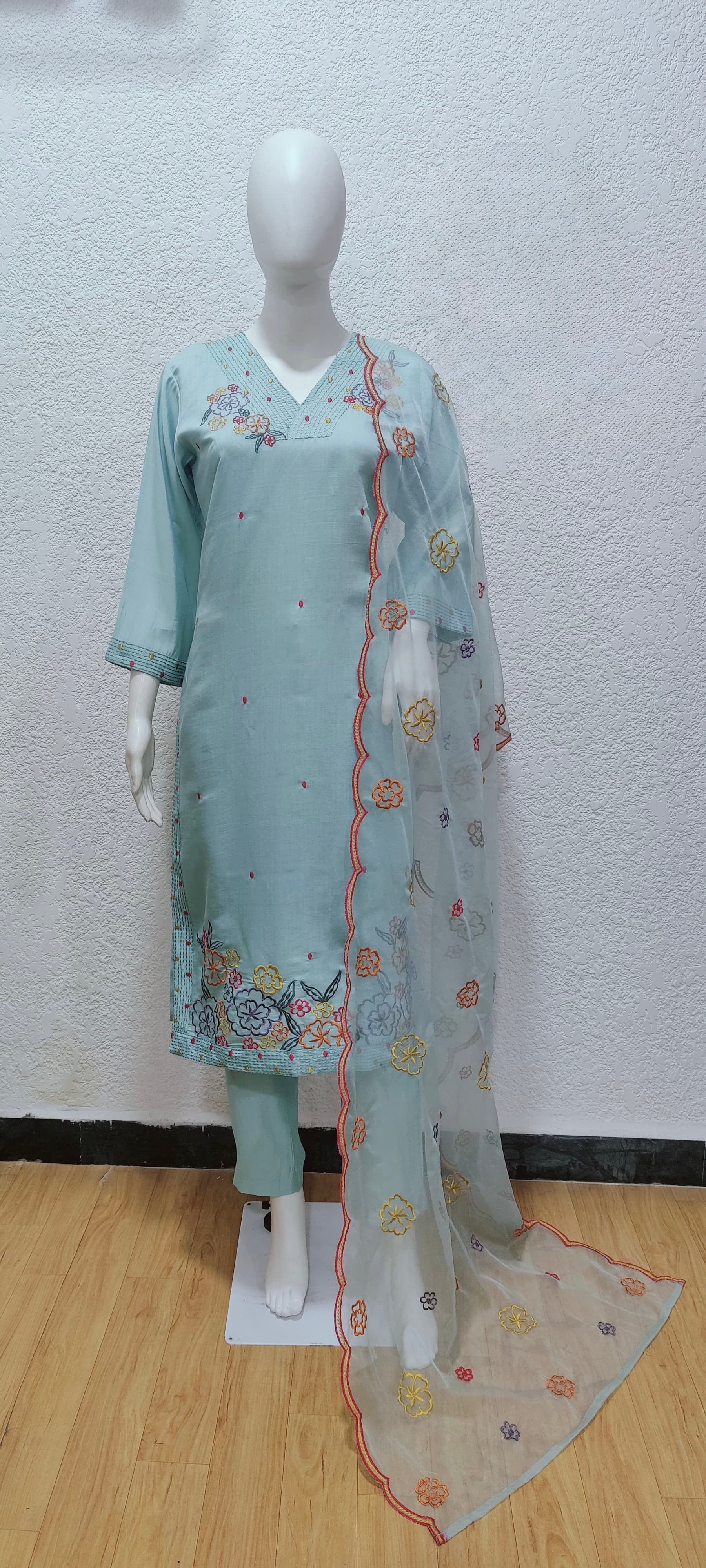 This graceful women’s ethnic three-piece set is designed in soft modal silk, offering a smooth texture and elegant fall. The kurta is highlighted with intricate embroidery work that adds refinement to its straight-cut silhouette. Lined with comfortable crepe fabric, it provides both structure and breathability. The set includes a coordinated pant and a matching dupatta adorned with delicate embroidered motifs, making it perfect for festive occasions, cultural gatherings, and semi-formal events. Available in a single elegant shade and sizes M to 2XL, this outfit blends traditional detailing with contemporary sophistication.