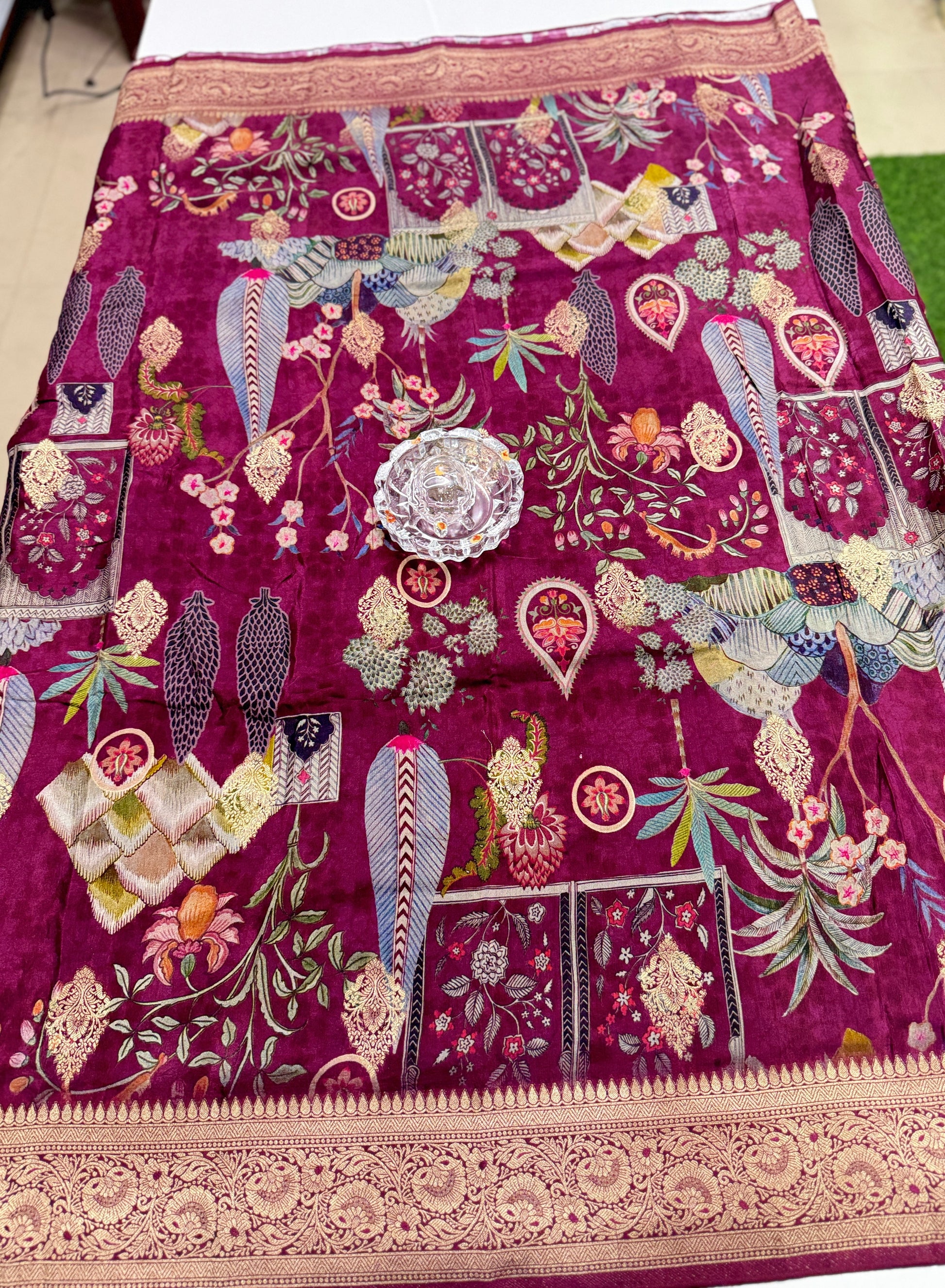 Design: Digital print with gold zari border and pallu