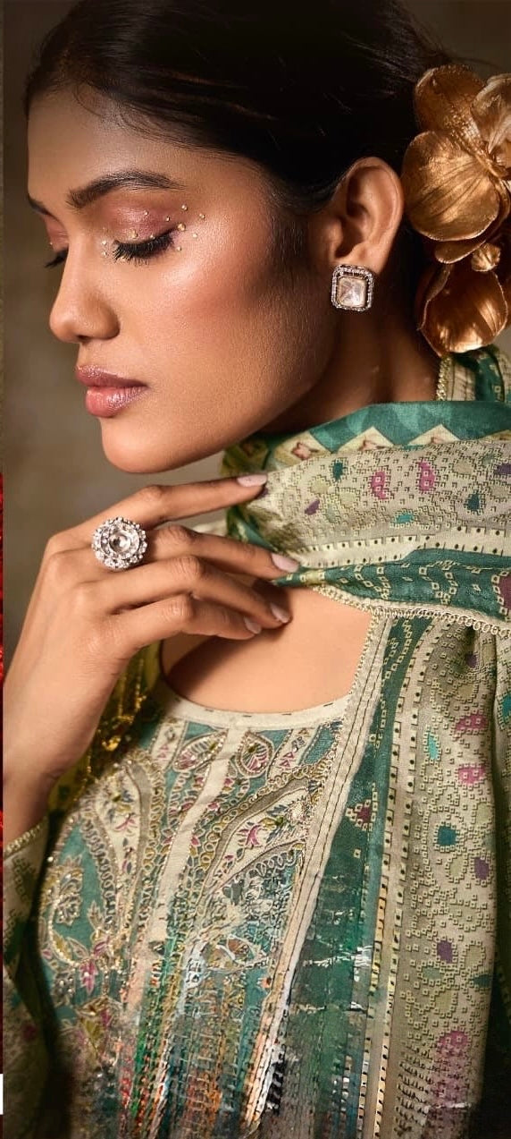 This muslin 3-piece suit set combines timeless artistry with refined embellishments, designed to elevate festive and special occasion dressing. The kurta is tailored from pure muslin fabric featuring digital prints, intricate aari embroidery, and sparkling Swarovski diamond work. A cotton mal inner ensures comfort and ease of movement. The bottom is crafted from viscose with a fancy lace finish, offering a sleek and elegant touch. Completing the ensemble is a muslin dupatta with digital print and a four-side lace border, adding a delicate charm. Available in L to 3XL sizes, this outfit is an ideal choice for weddings, festive gatherings, and cultural celebrations, balancing elegance with comfort.