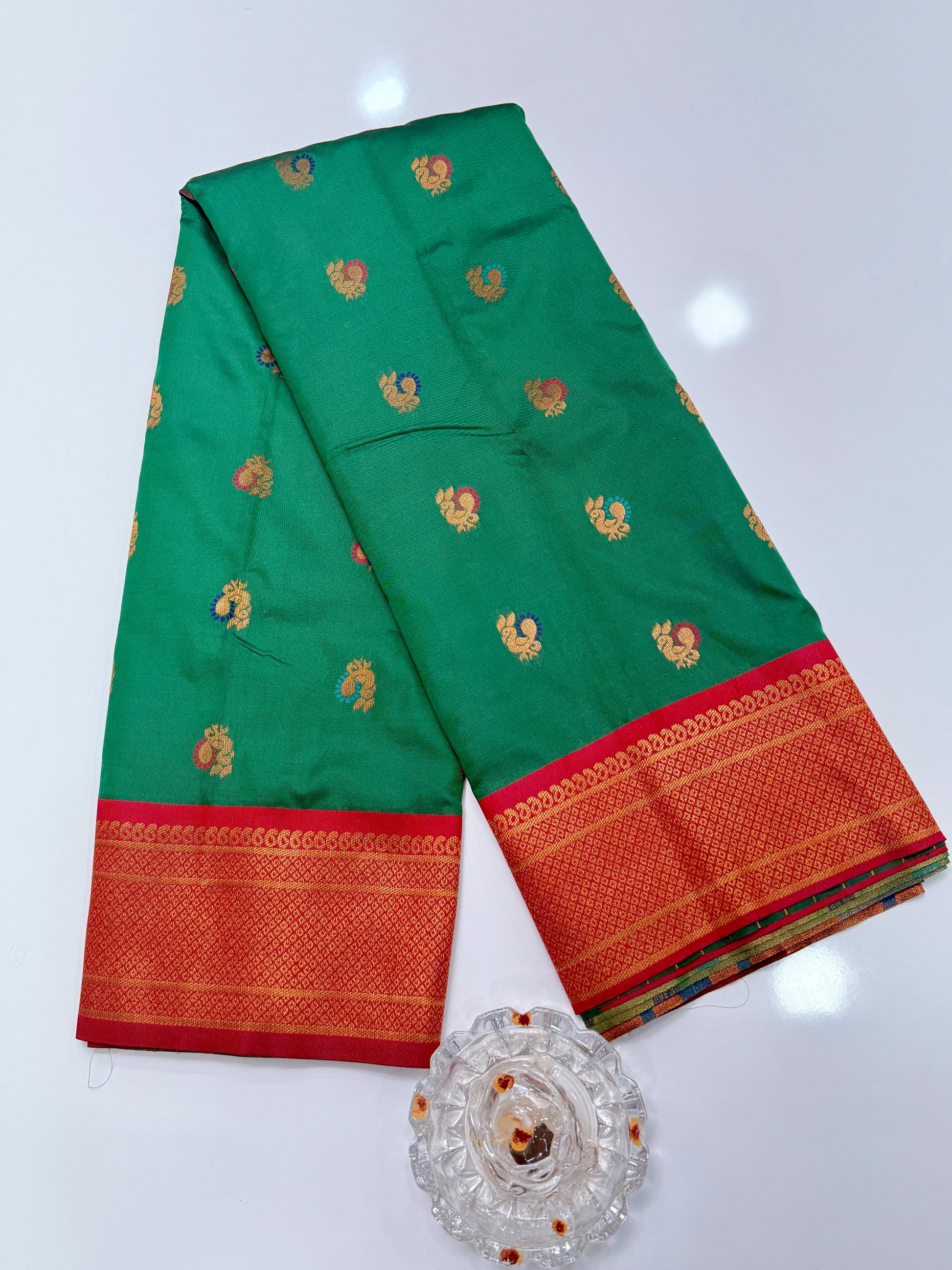 This Paithani soft silk saree is designed with traditional zari weaving and intricate motifs along the border and pallu. The lightweight soft silk fabric ensures a graceful drape and festive comfort. Paired with a matching contrast blouse, this saree is an elegant choice for weddings, functions, and cultural occasions.