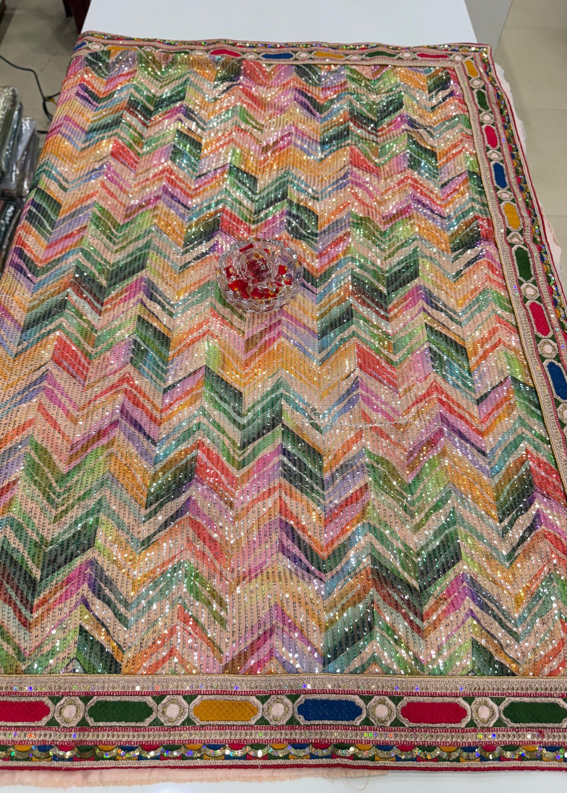 - Work: 3D floral embroidery, sequin embellishments, multicolour border