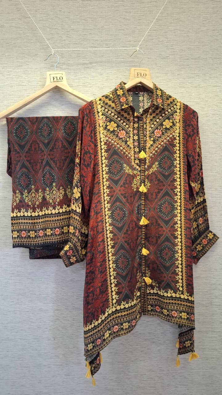 Premium Crepe Ajrakh Print Style Cord Set with Tassel Detailing for Women – Sizes 38 to 44