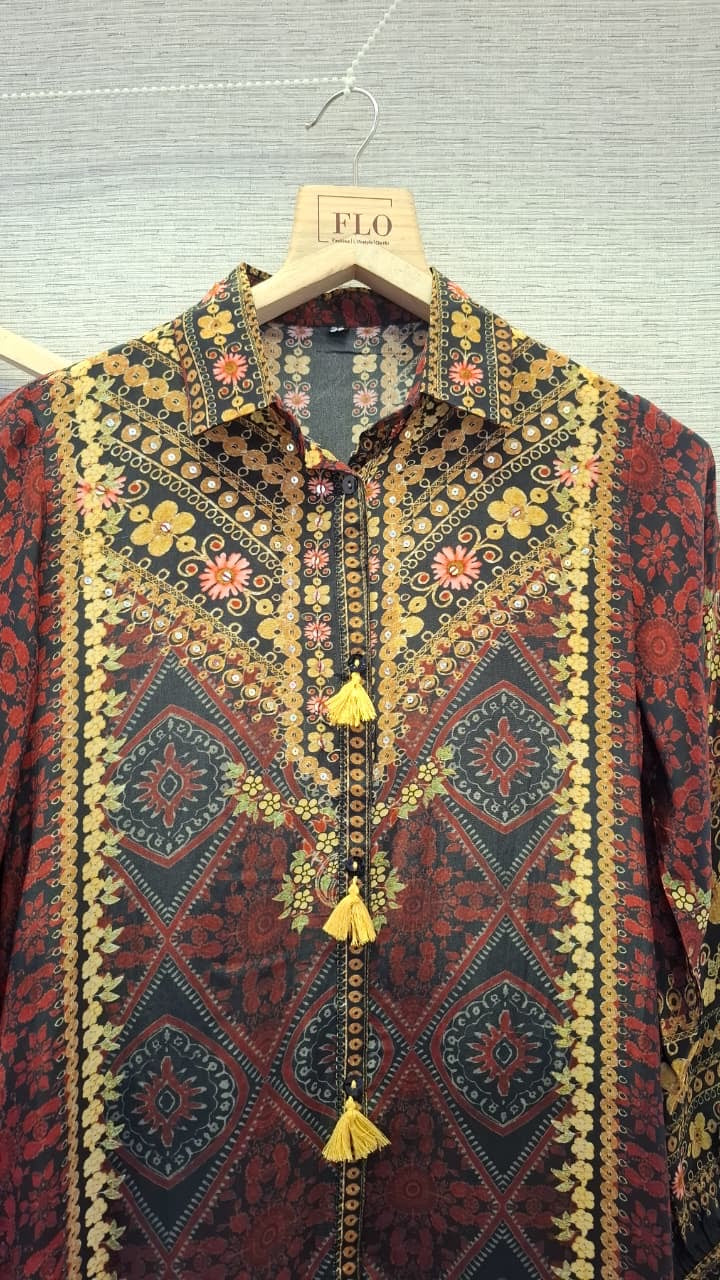 Perfect for cultural events, festive get-togethers, and social gatherings, this coord set pairs well with both traditional jewelry and contemporary accessories. The tassel accents and bold Ajrakh-style placement print create a statement look that balances ethnic heritage with modern fashion trends.