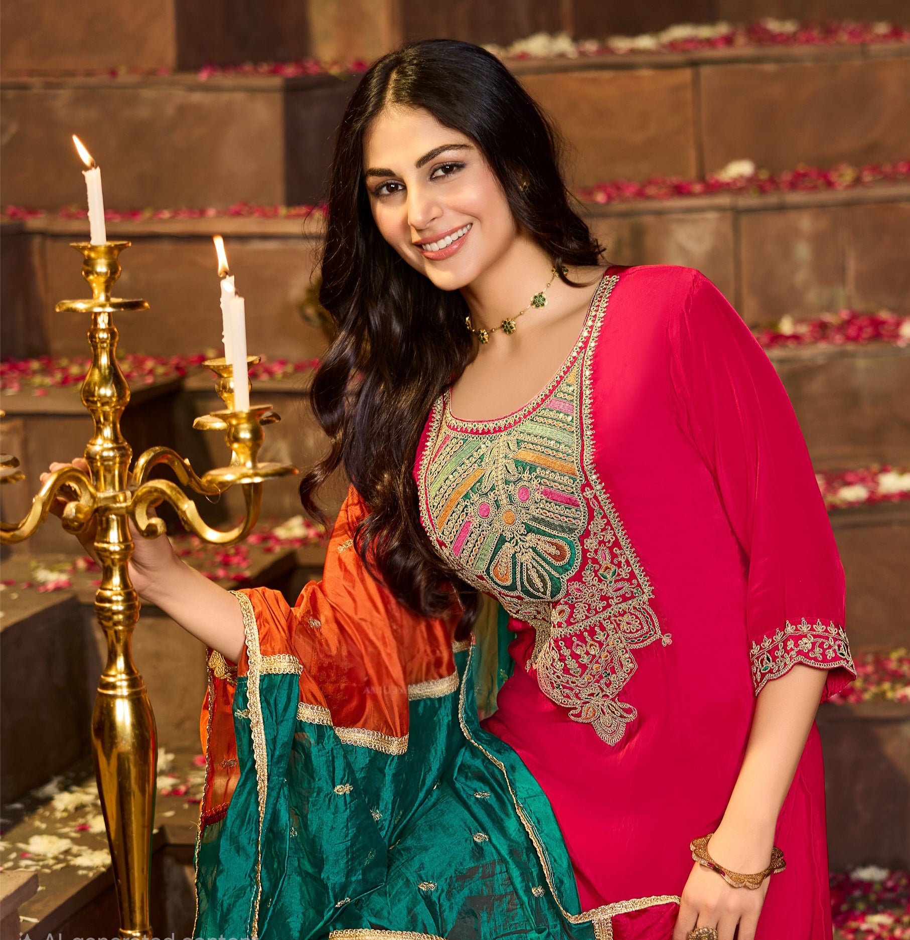 Presenting a graceful three-piece ethnic ensemble crafted from pure natural crepe fabric, designed to combine luxury, comfort, and festive allure. The kurta features intricate hand-finished embroidery with heavy coding sequence and multi-thread detailing that radiates richness.