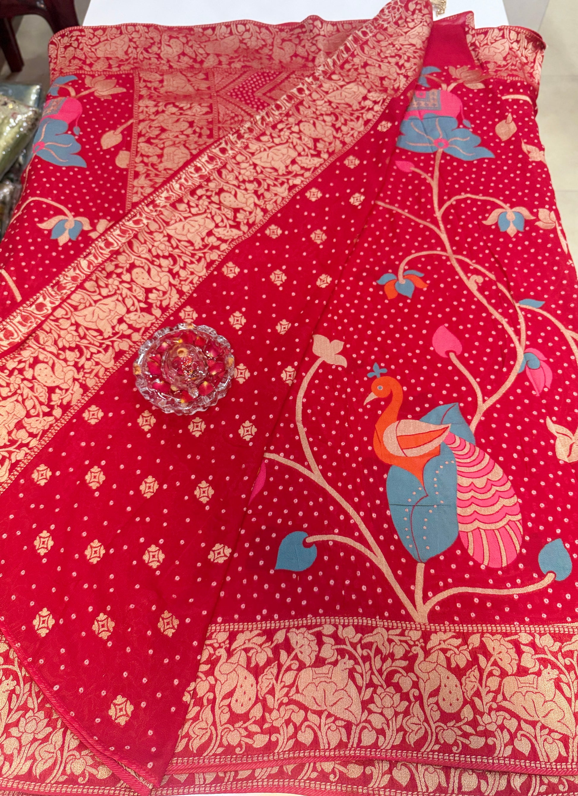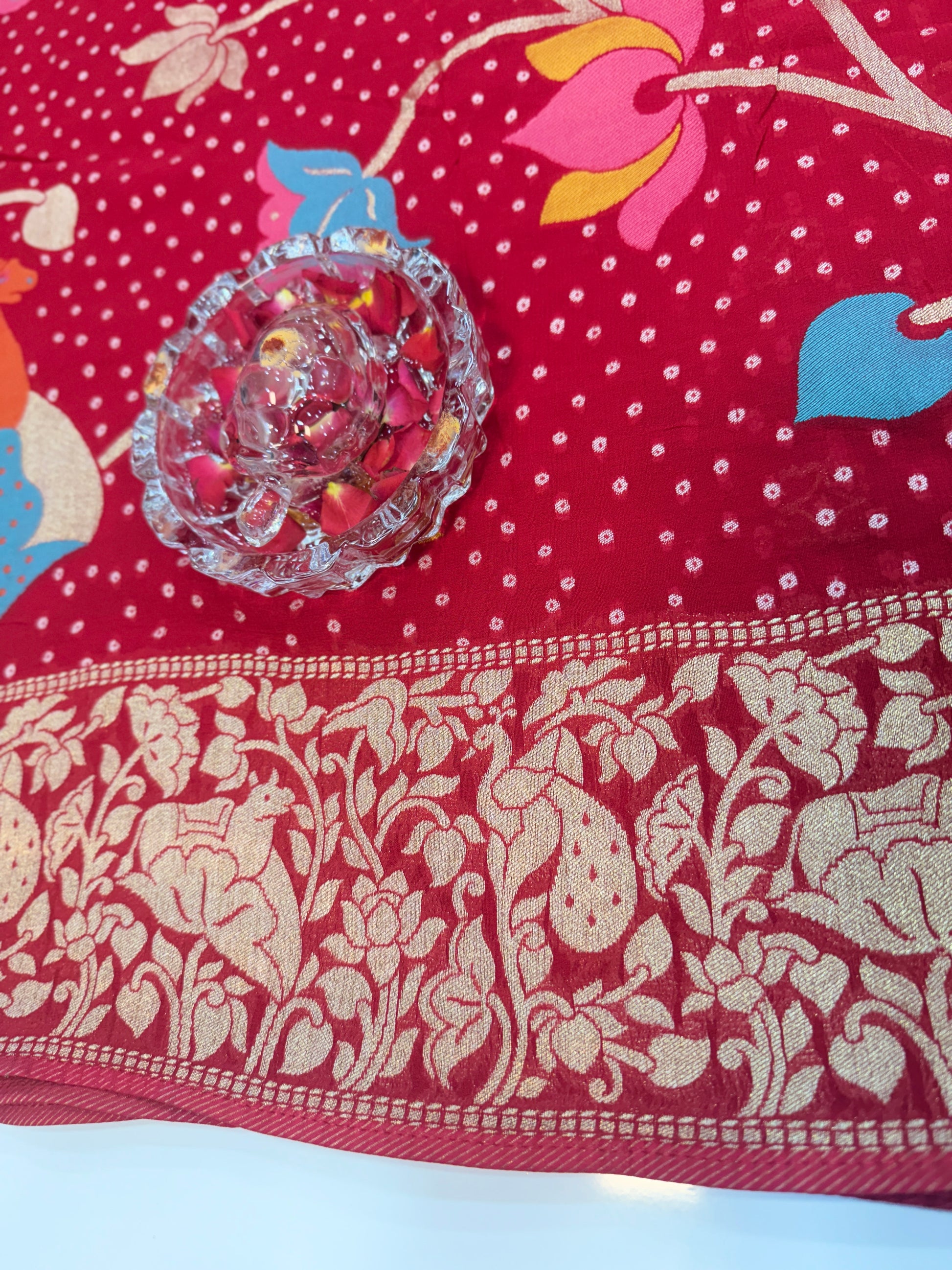 Pure Kaddi Georgette Zari Weaving Saree in Crimson Red with Traditional Floral Jaal and Rich Border – Festive & Wedding Wear Saree for Women