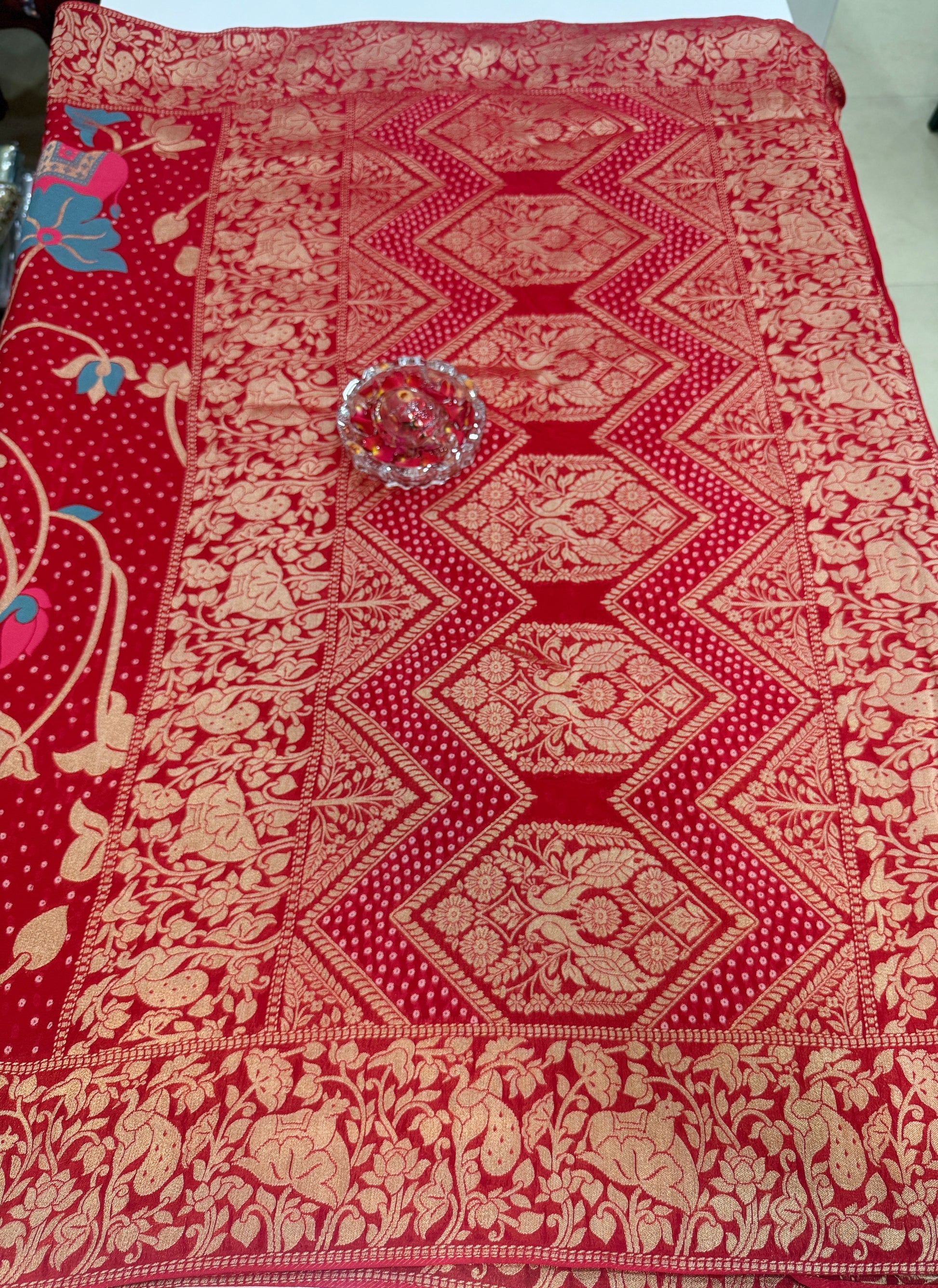This exquisite pure Kaddi Georgette saree in deep crimson red embodies heritage artistry through its intricate zari floral jaal and detailed woven border. Crafted on a fine, lightweight georgette base with a soft sheen, it combines traditional Banarasi-inspired weaving and festive grandeur. The saree drapes beautifully with a fluid fall, ideal for weddings, receptions, and ceremonial occasions.