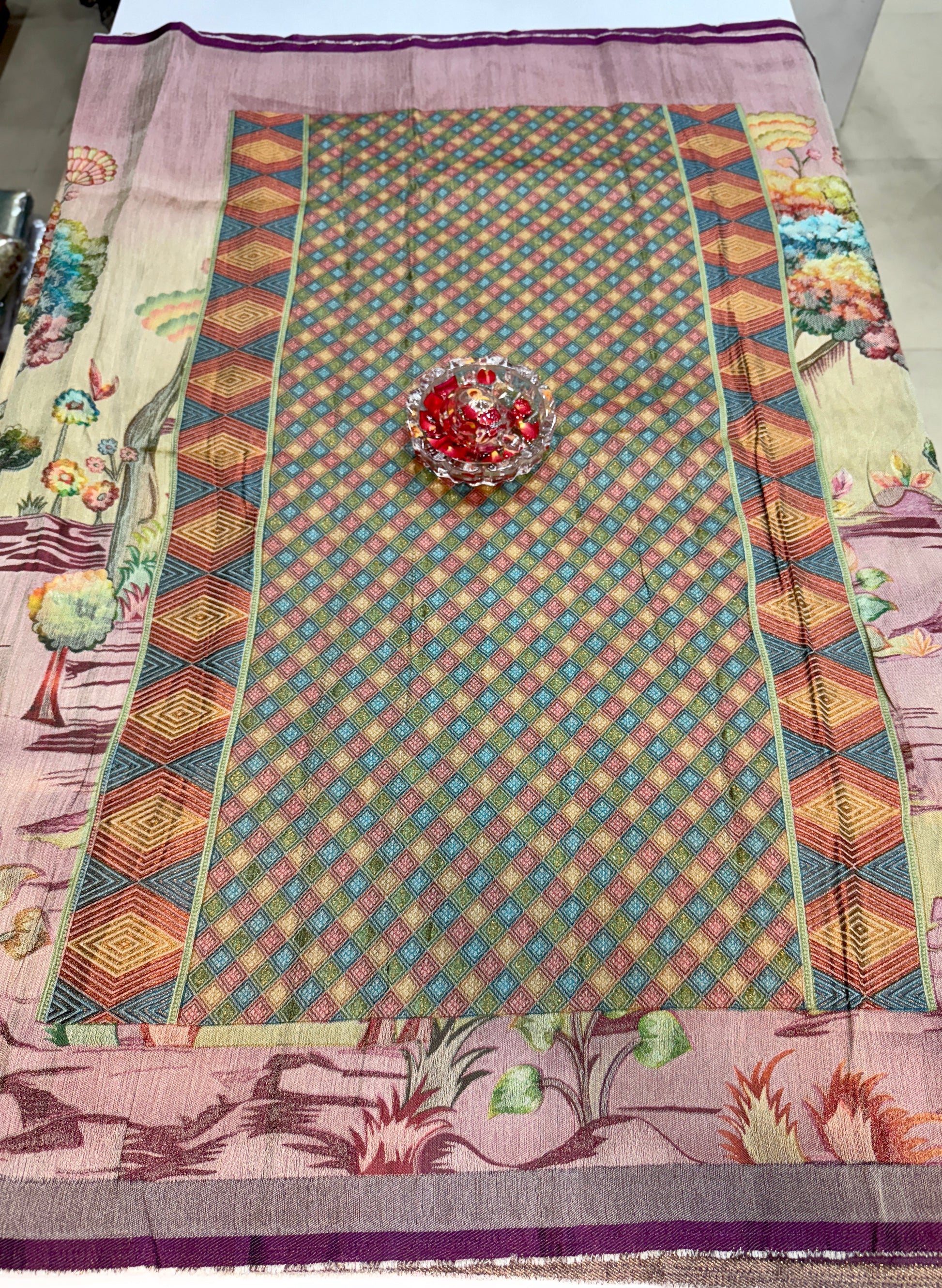 Pure Ziraf Silk Peacock Print Saree with Colorful Nature Motifs and Geometric Border – Soft Silk Printed Saree for Women