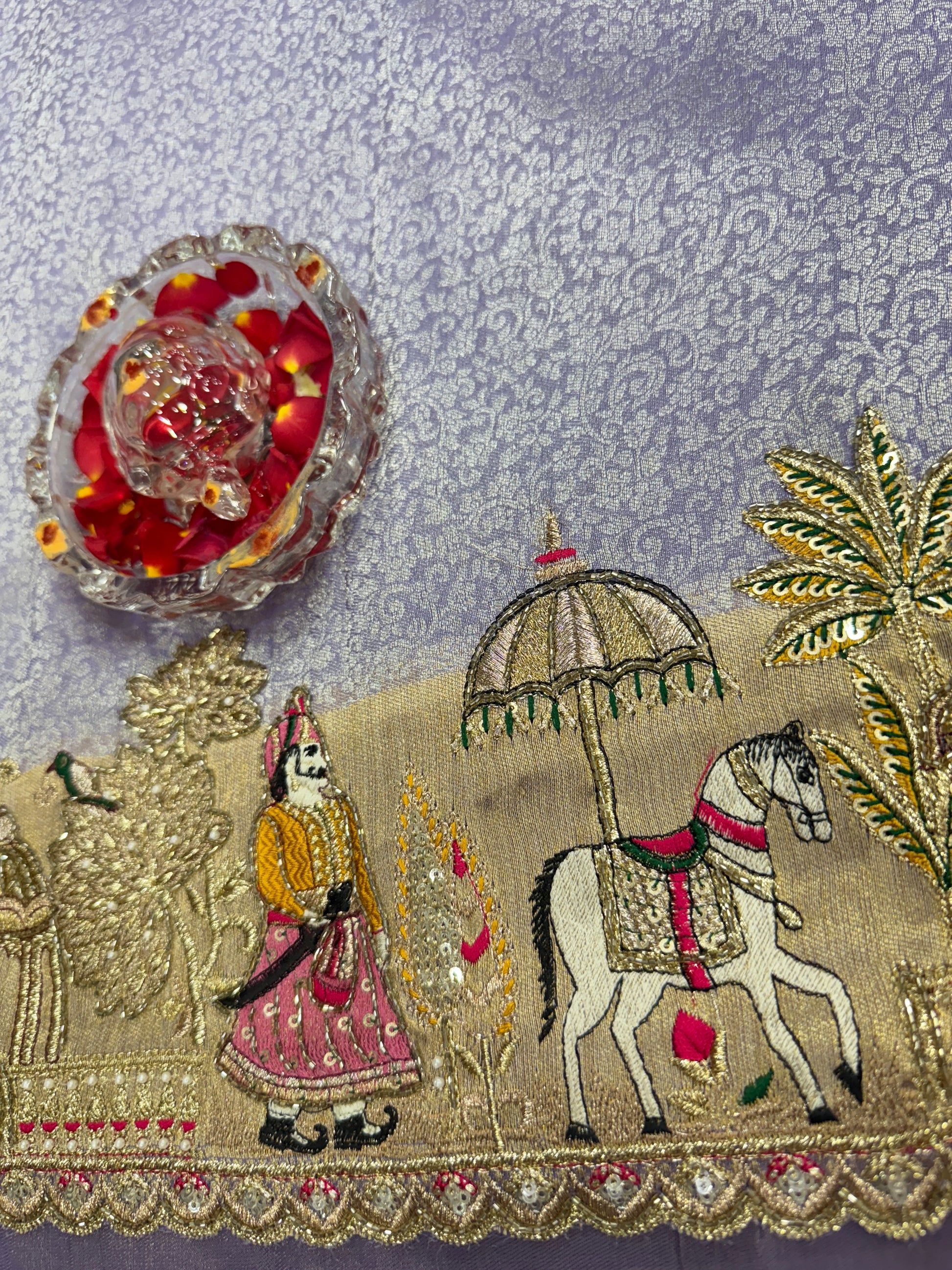 Intricately adorned with zari and thread embroidery, the saree is further elevated by cut-dana, moti, and mirror embellishments meticulously hand-worked across the body and pallu. Each sparkle catches light delicately, creating a luxurious play of shimmer ideal for bridal trousseaus and festive occasions.
