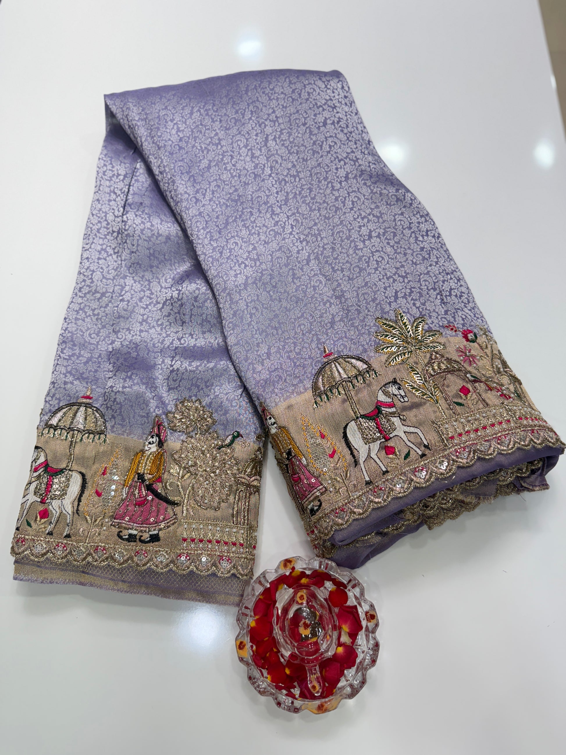 The saree comes with a matching Ziraf silk blouse piece, enabling versatile tailoring for personalized styling. Every detail — from the richness of the embroidery to the soft sheen of the silk — reflects Mani’s Fashions’ commitment to refined craftsmanship, offering a piece that stands the test of time in both design and artistry.