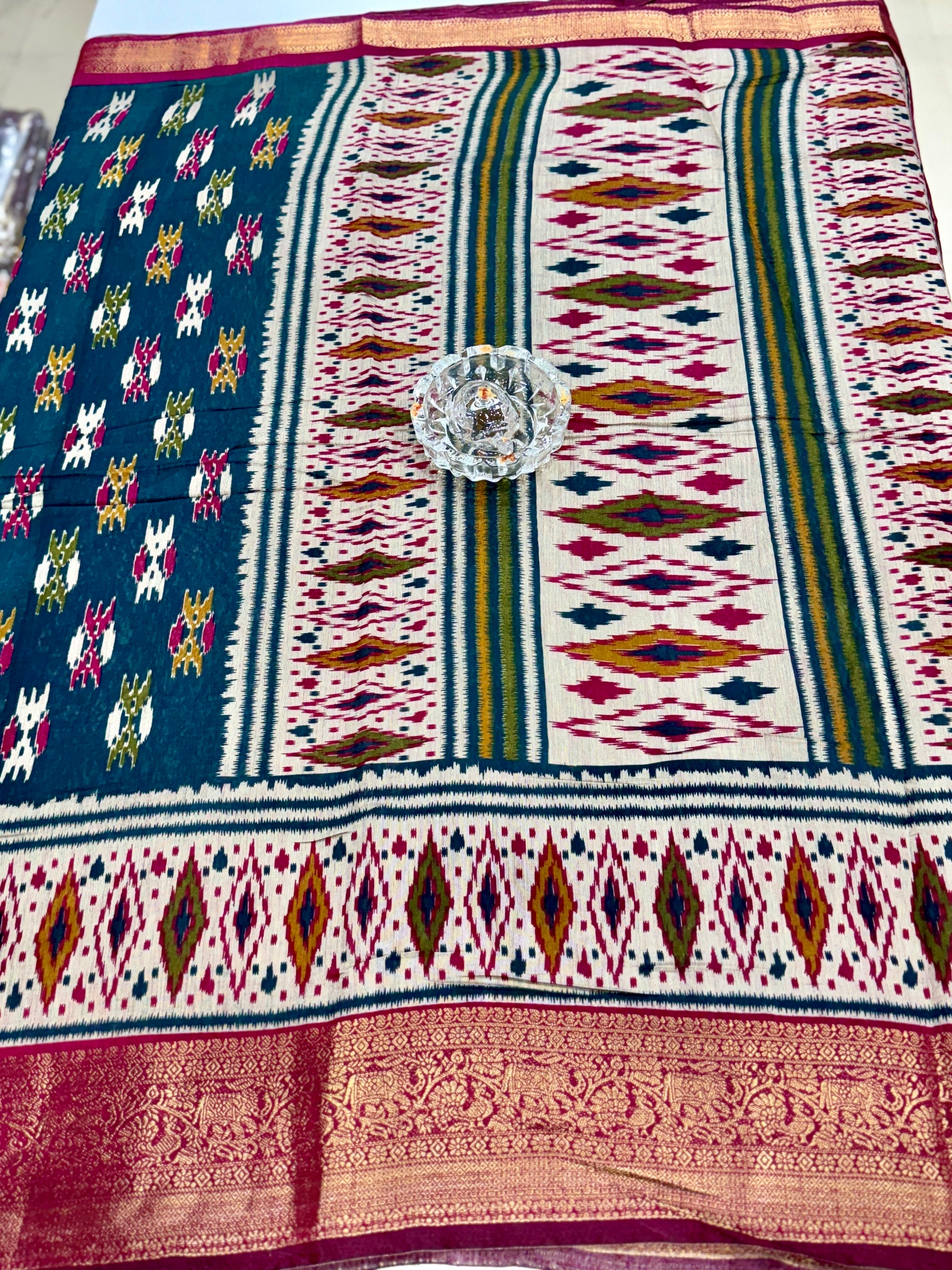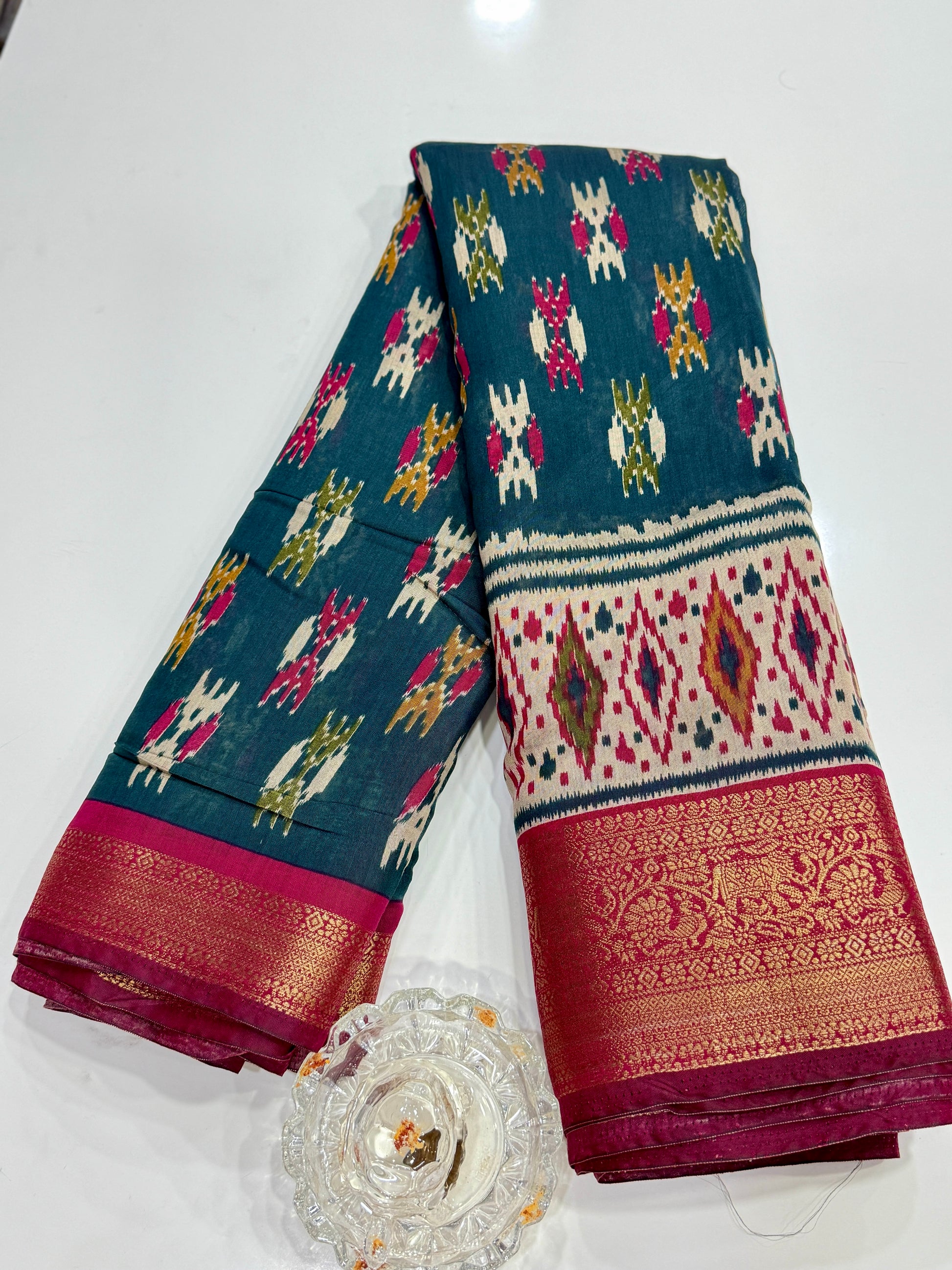 The body of the saree showcases multi-colour geometric motifs similar to handloom ikat patterns, while the border and pallu carry woven zari work that enhances the saree’s traditional character. The fabric offers a smooth, easy drape suitable for long wear, making it ideal for cultural functions, festive gatherings, temple visits, family events and semi-formal occasions. This saree includes a matching unstitched blouse piece with coordinated woven detailing.
