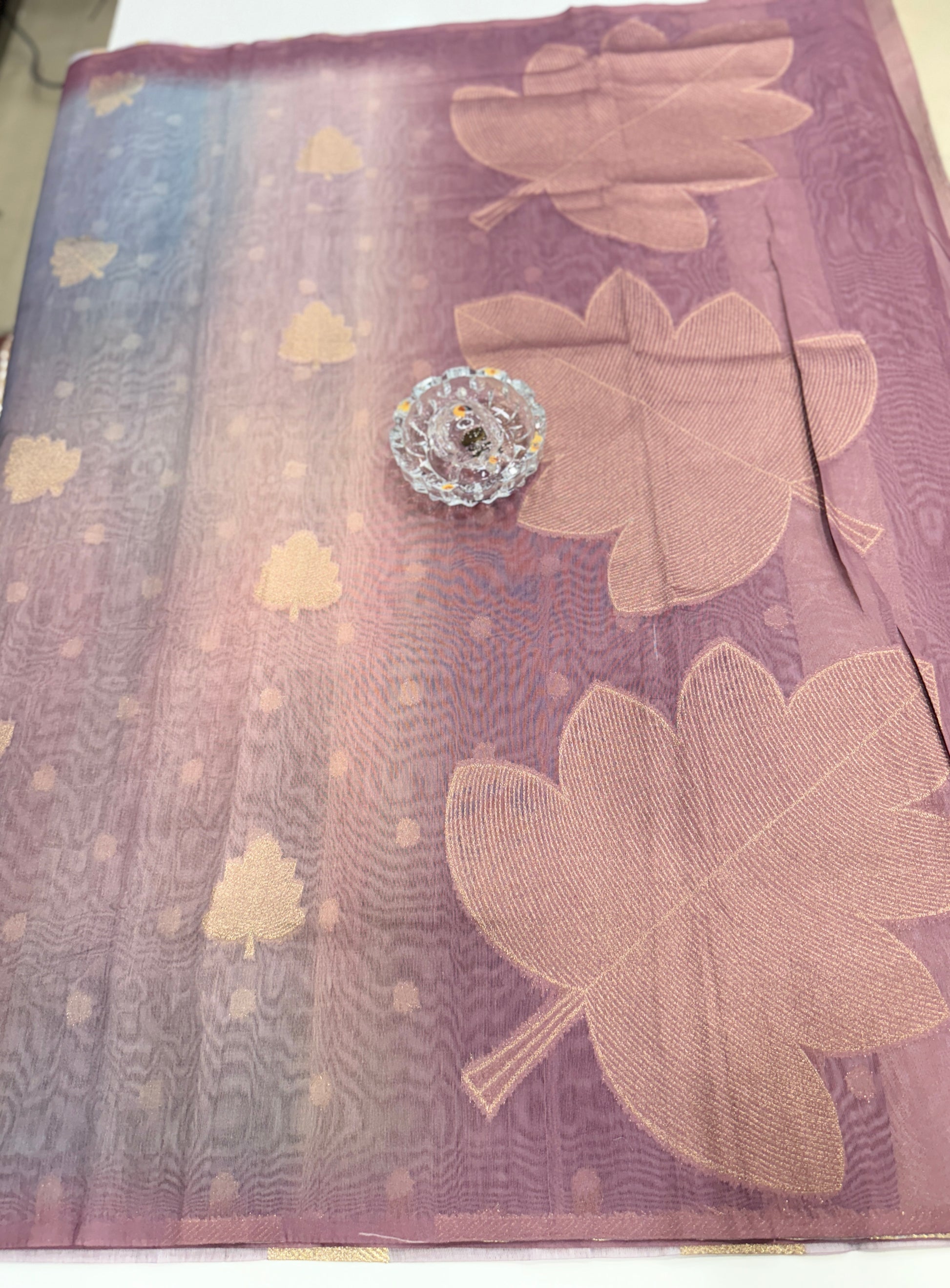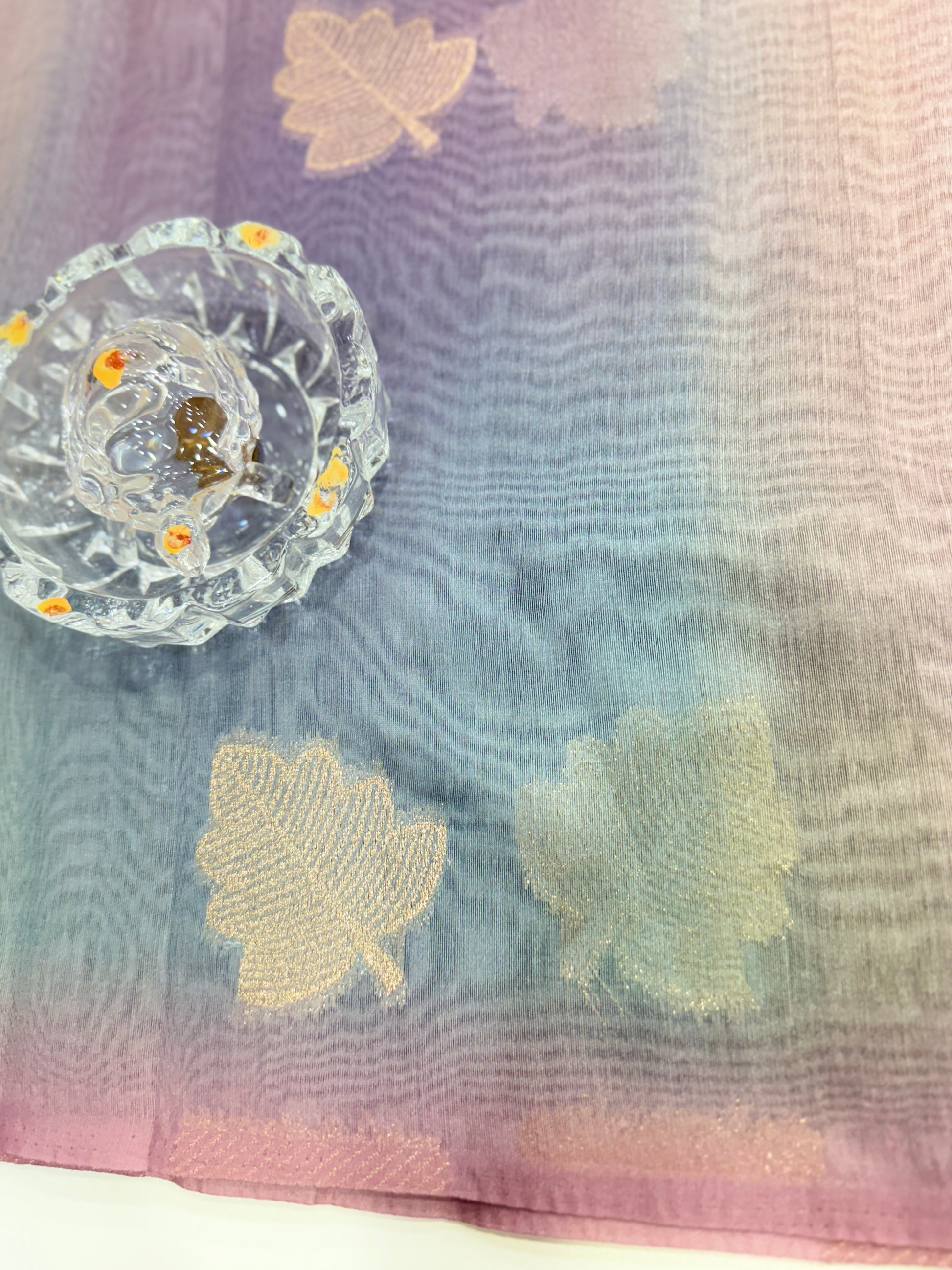 This exquisite soft handloom silk saree is crafted with a smooth and lightweight drape, featuring elegant zari leaf motifs woven across an ombré gradient body. The design flows beautifully through shades of lavender, blue, beige, green, and mauve, creating a serene and sophisticated look. The saree is paired with a matching silk blouse piece, complementing the rich yet subtle hues. Ideal for festive occasions, weddings, and elegant gatherings, this saree combines traditional craftsmanship with a contemporary color palette, offering both comfort and grandeur in every fold.
