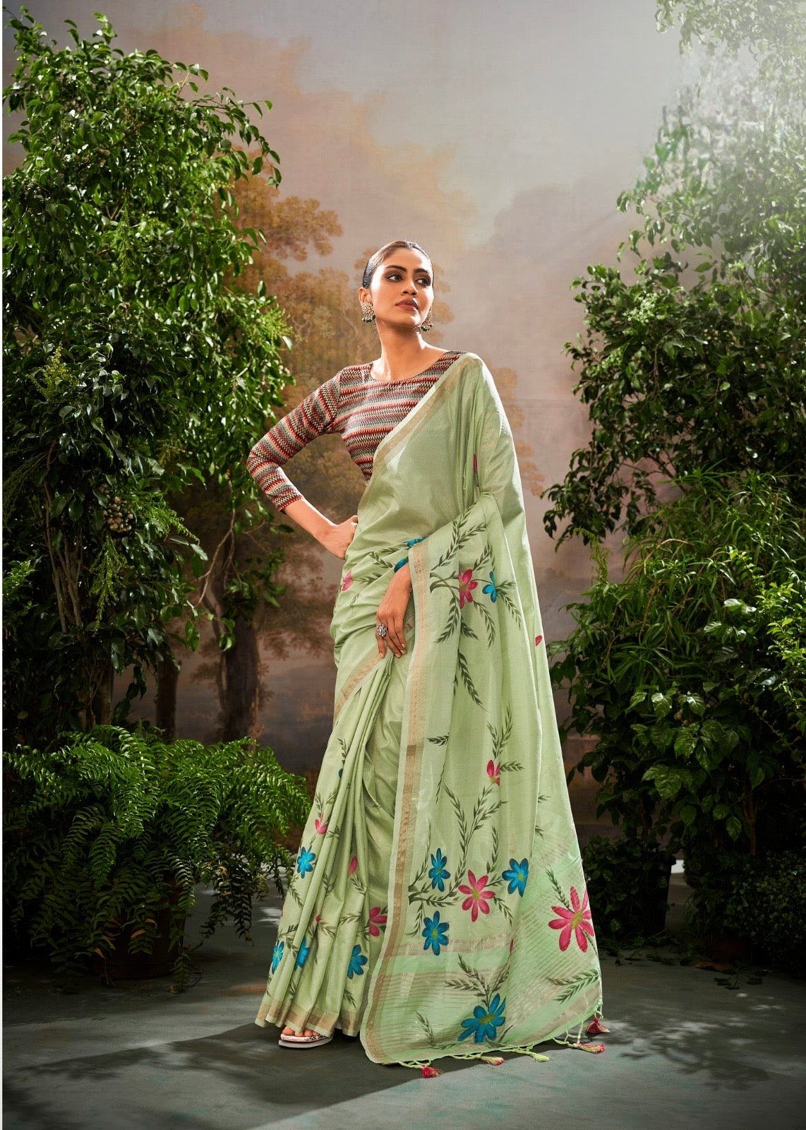 The Soft Linen Tissue Saree is a perfect fusion of contemporary design and traditional artistry. Crafted from lightweight linen tissue fabric, it features a hand brush print that adds a modern and artistic appeal. The saree drapes beautifully, combining comfort with sophistication, making it suitable for both festive and formal occasions.