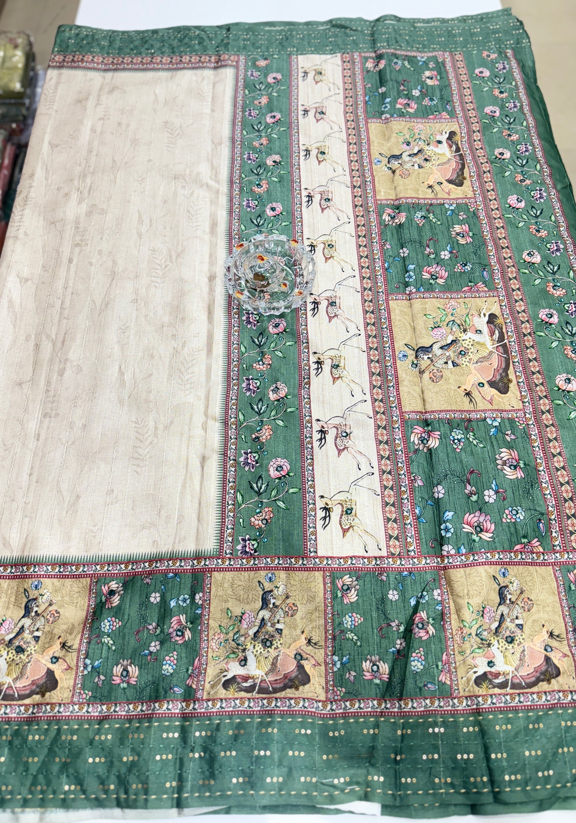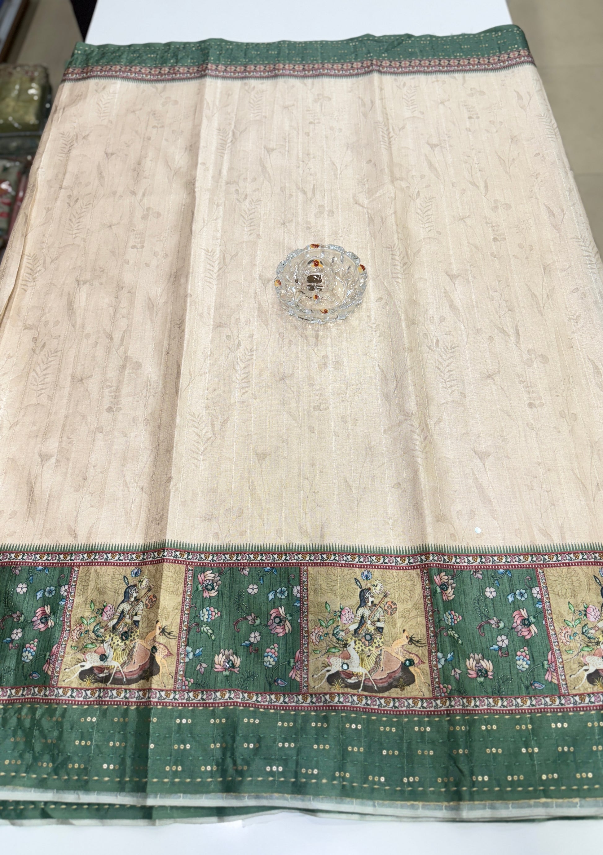 This designer saree is crafted from soft tussar fabric, detailed with katha-style printed borders and delicate mirror work across the drape. The saree combines traditional artistry with modern prints, offering motifs such as Radha Krishna scenes and floral vines that bring cultural richness to the look.