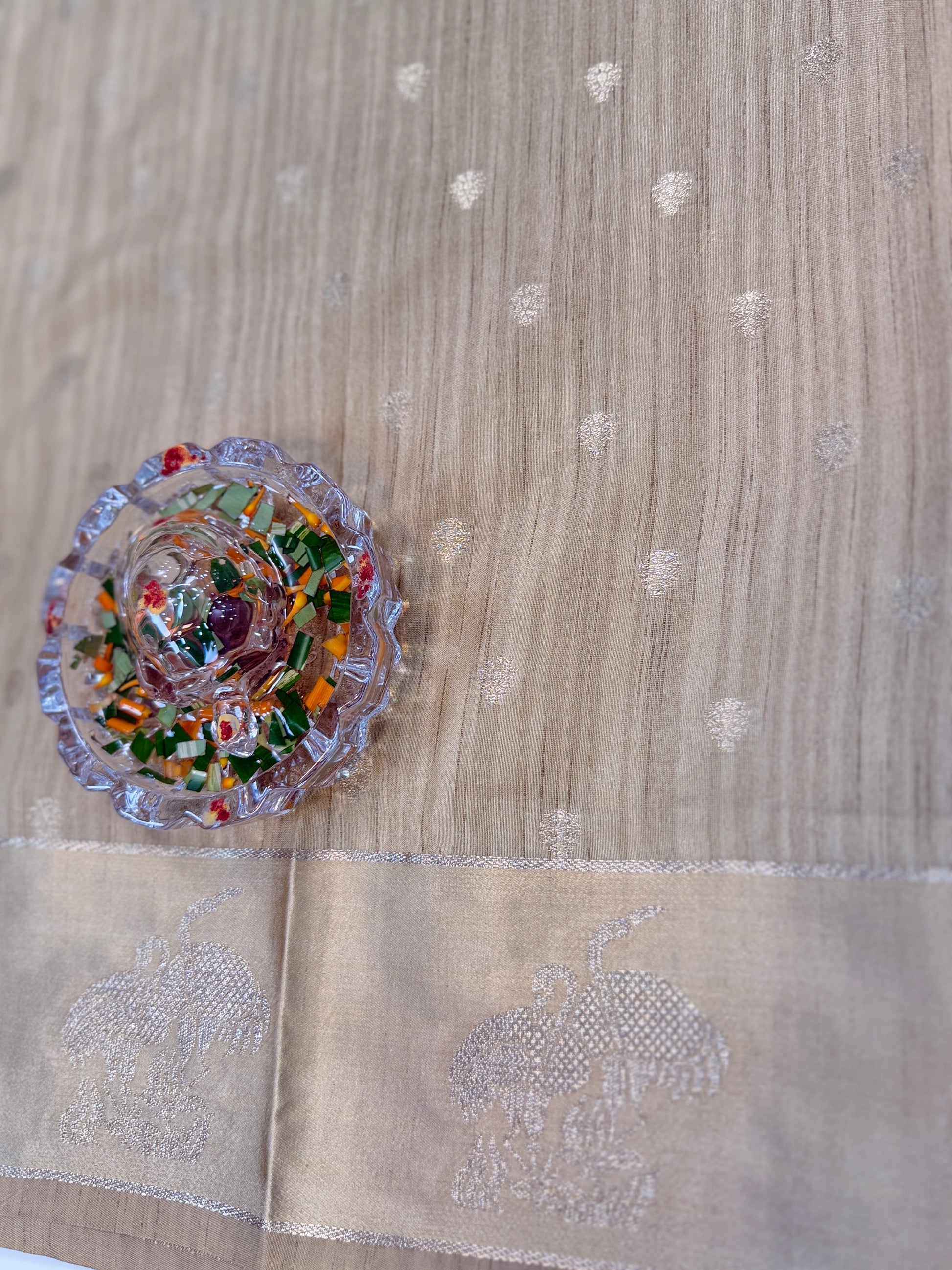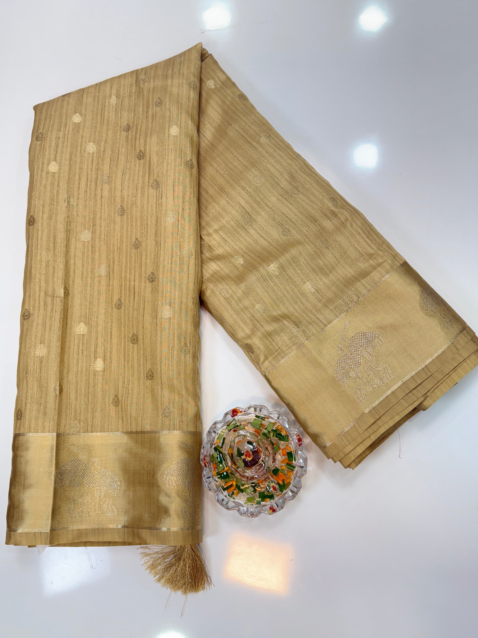 This Tussar silk saree with satin border combines the richness of tussar texture with the sheen of satin, creating a graceful drape ideal for festive and cultural occasions. Designed in vibrant shades such as pink, green, blue, mustard, beige, and purple, each saree features elegant woven motifs and a coordinating blouse piece. The satin border enhances the overall finish, offering a refined contrast that elevates the traditional look. Lightweight and versatile, this saree is well-suited for family gatherings, festive celebrations, or daily cultural wear where elegance meets comfort.
