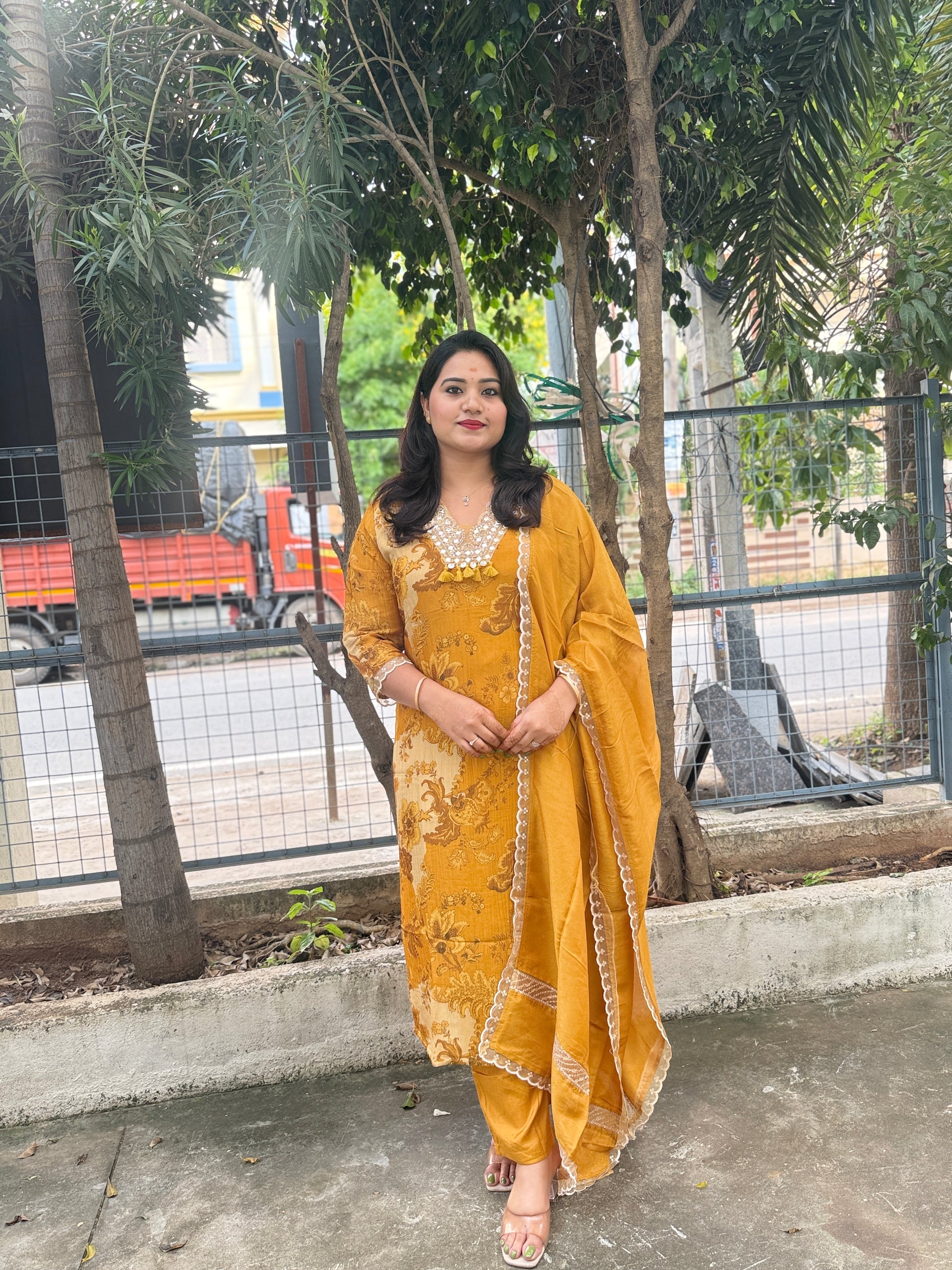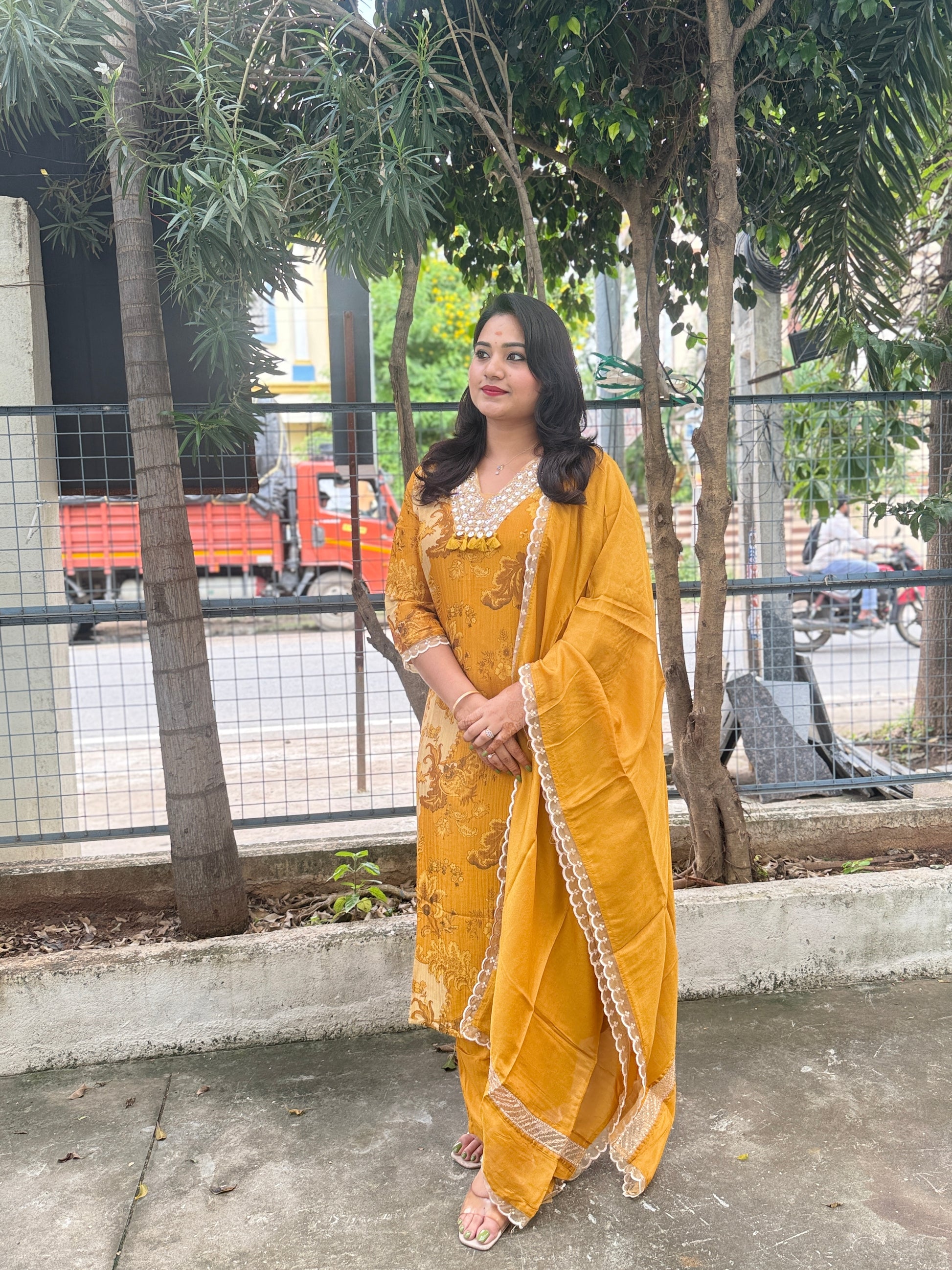 This mustard yellow shimmer suit set blends festive charm with timeless elegance. Crafted from premium crush shimmer fabric, the kurta features intricate detailing work around the neckline and sleeves, adding artisanal refinement. The straight-cut kurta is paired with matching pants for ease of movement, and the coordinating dupatta carries subtle lace highlights to complete the ensemble. With its lustrous texture and graceful fall, this outfit is perfect for weddings, festive functions, and traditional occasions. Available in sizes M, L, XL, and XXL, it offers both comfort and a flattering fit for women.