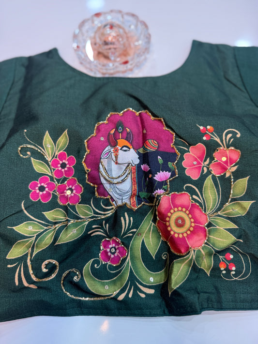 Silk printed readymade blouse for women with antique handcrafted work, size 38โ42, short sleeve, saree blouse
