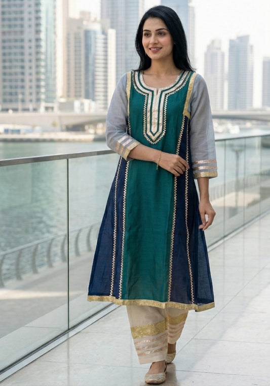 Mul Chanderi Kurti Pant Set for Women Panel Design Straight Kurta with Woven Bottom Ethnic Set