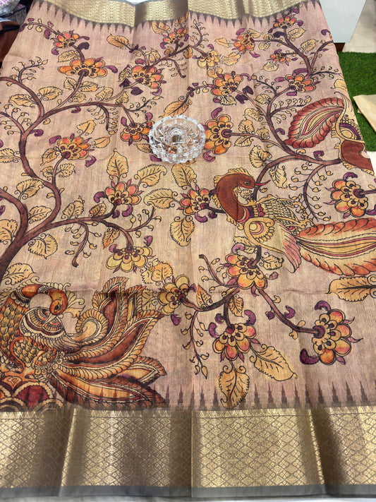 Pashmina Silk Kashmiri Printed Saree for Women Kalamkari Bird Floral Design with Zari Border Ethnic Saree