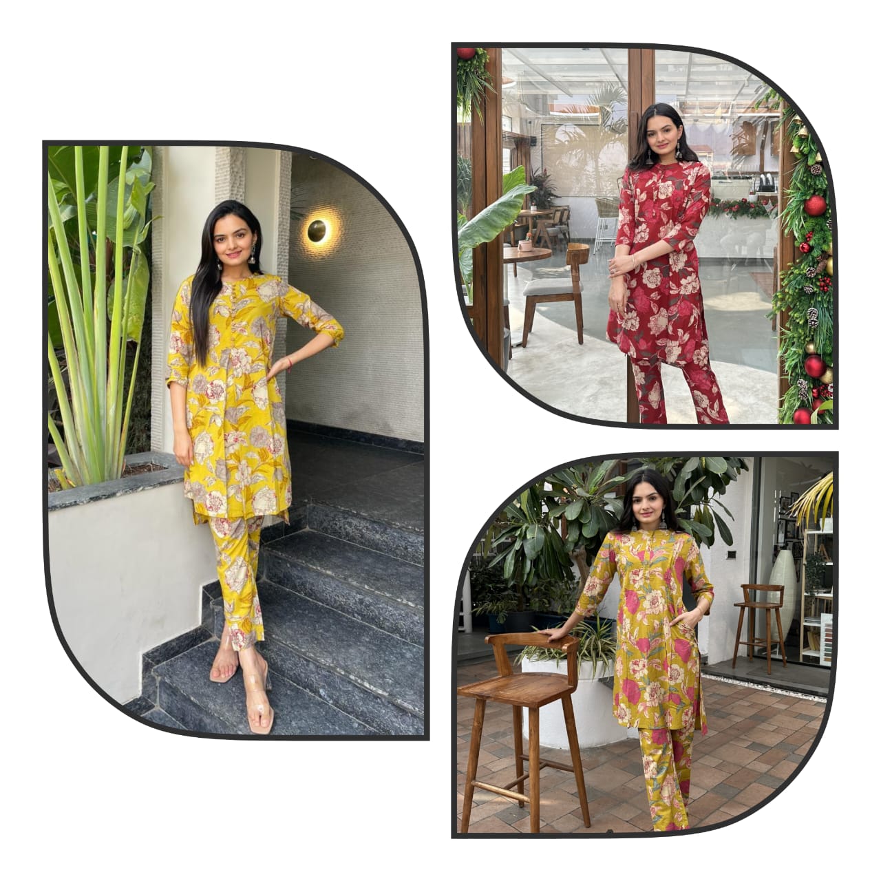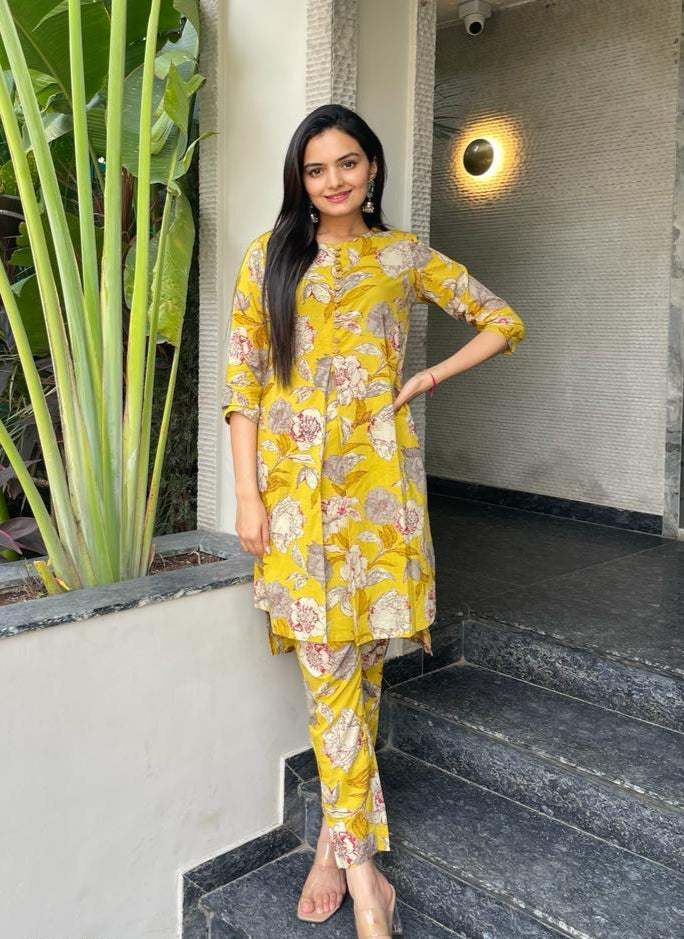 This co-ord set combines seasonal charm and breathable comfort, offering a refined yet easy-going ethnic outfit for everyday elegance.