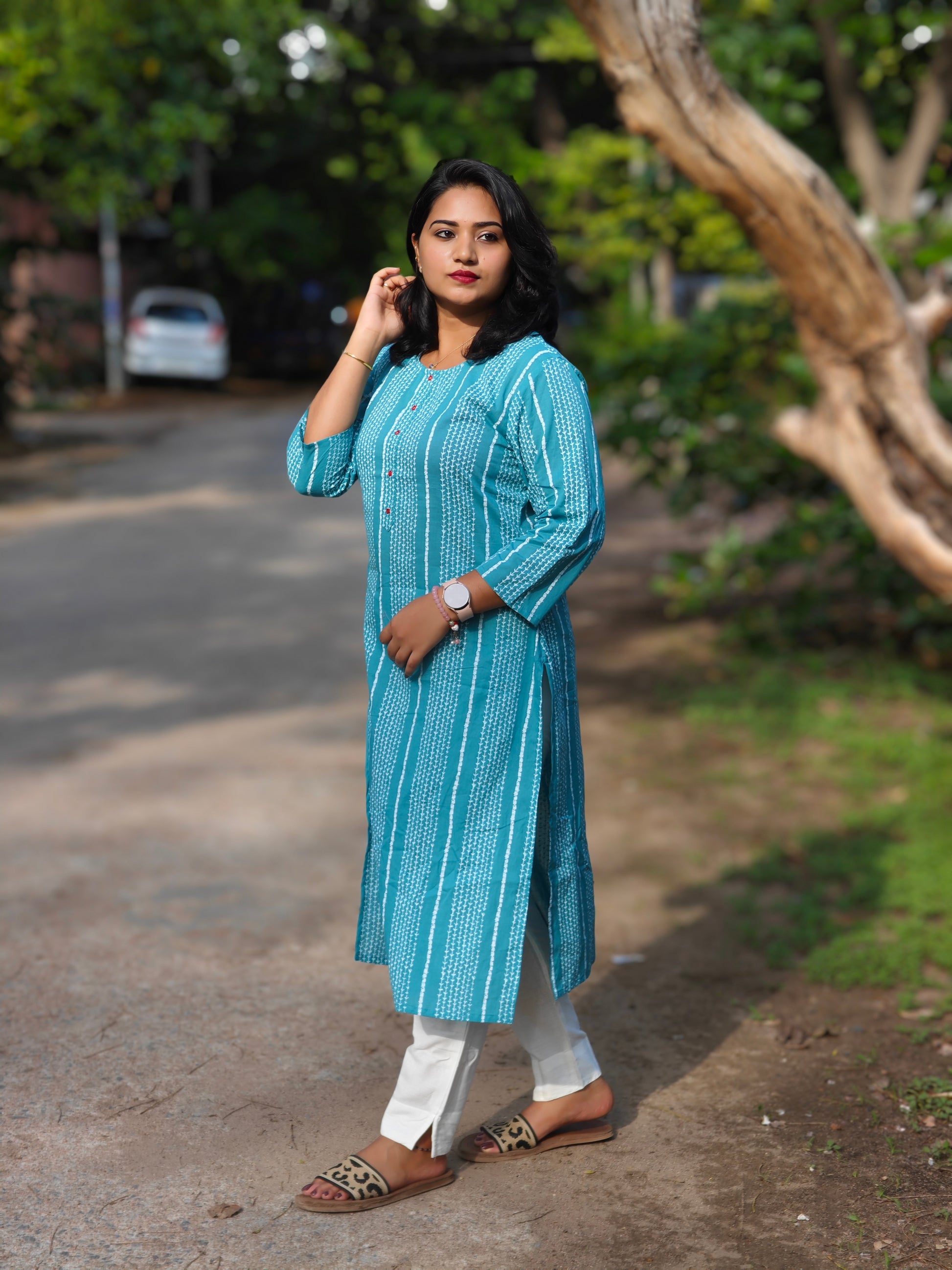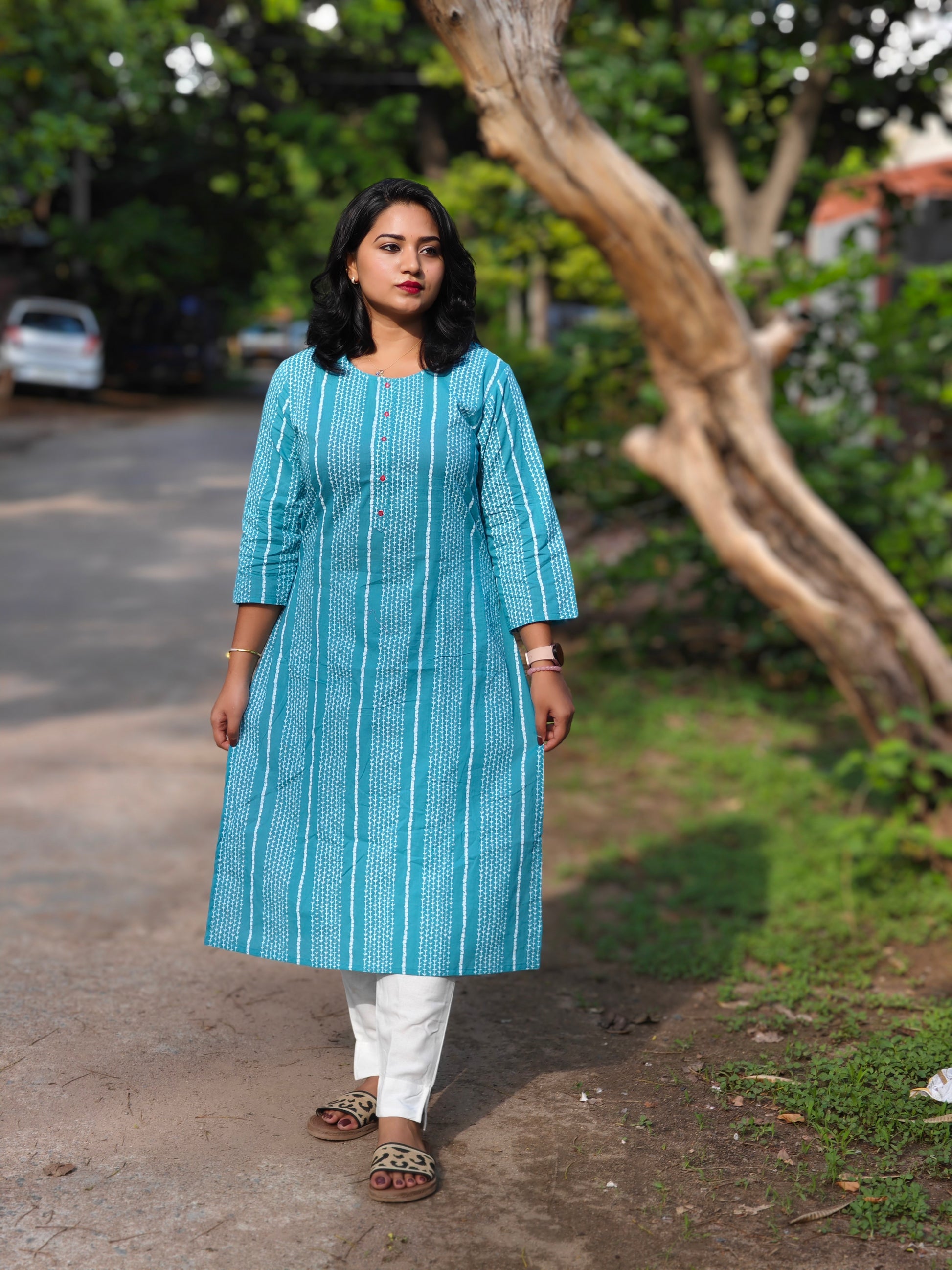 The kurta features vertical stripes that add a slimming effect while giving it a contemporary ethnic touch. The front button placket adds practical styling, while the round neckline and 3/4th sleeves ensure ease of wear across all seasons. With side slits for added comfort and movement, the calf-length cut pairs effortlessly with white pants, palazzos, or leggings. Available in inclusive sizes from S to 3XL, this kurta ensures a flattering regular fit for all body types. Perfect for women seeking everyday ethnic wear that balances style with simplicity.