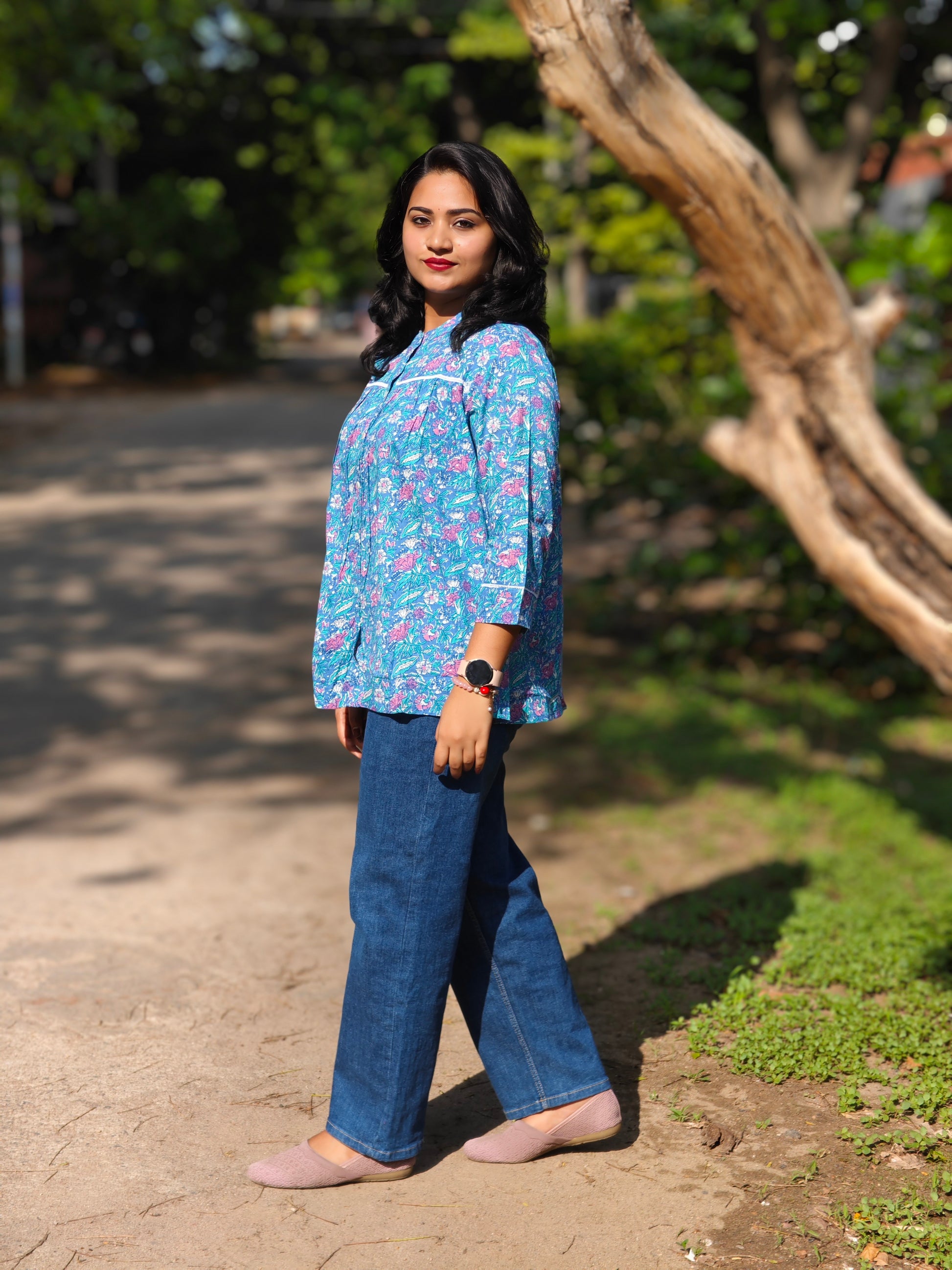 This blue cotton floral print short top offers a blend of everyday comfort and charming style, perfect for versatile wear across seasons. Crafted from breathable cotton, the top features a lively all-over floral pattern in soft contrasting tones. Its relaxed straight fit and modest neckline provide ease of movement, while the three-quarter sleeves add a balanced touch of coverage. Ideal for pairing with jeans, skirts, or trousers, it works equally well for casual outings, office wear, or travel.