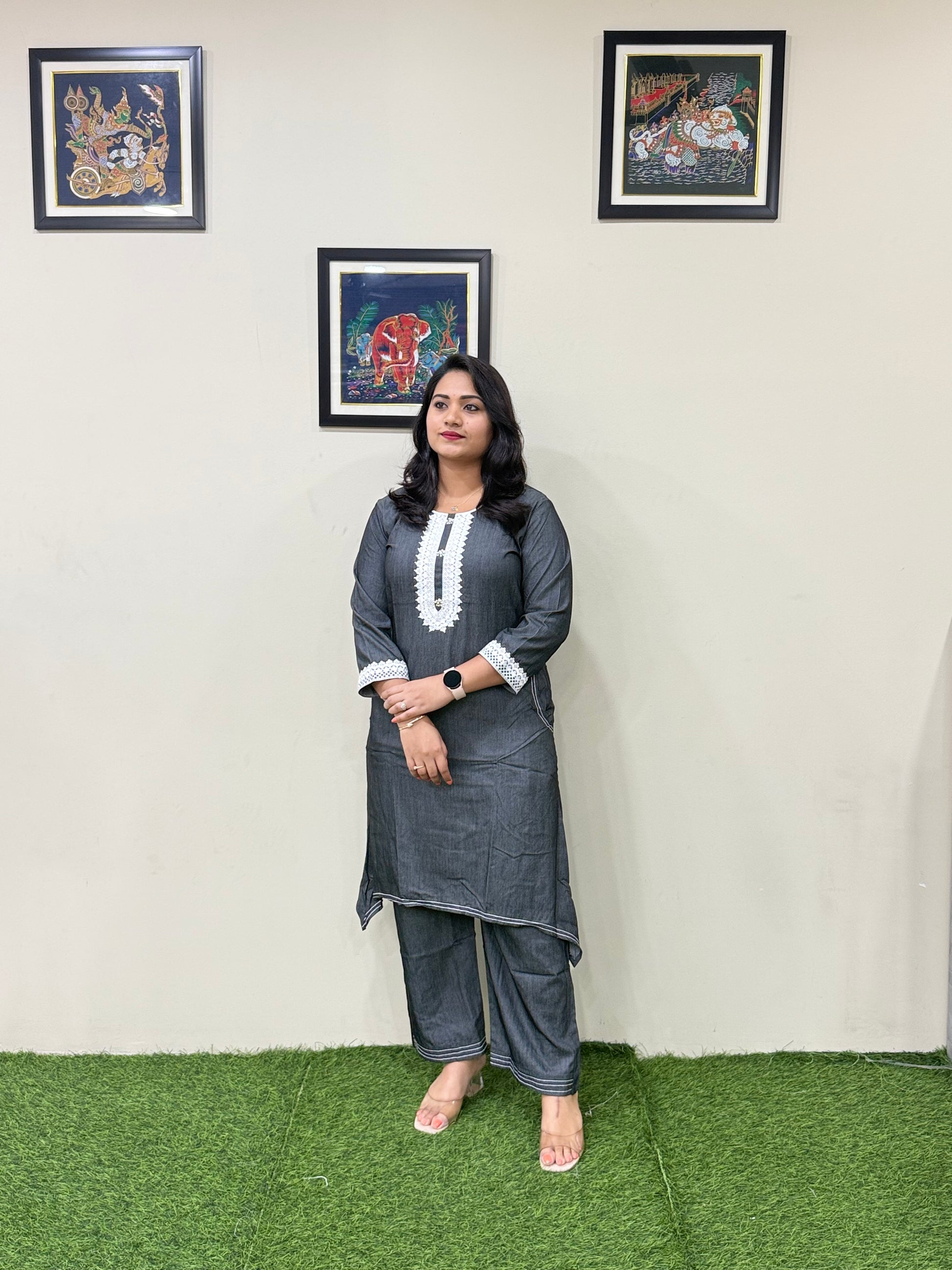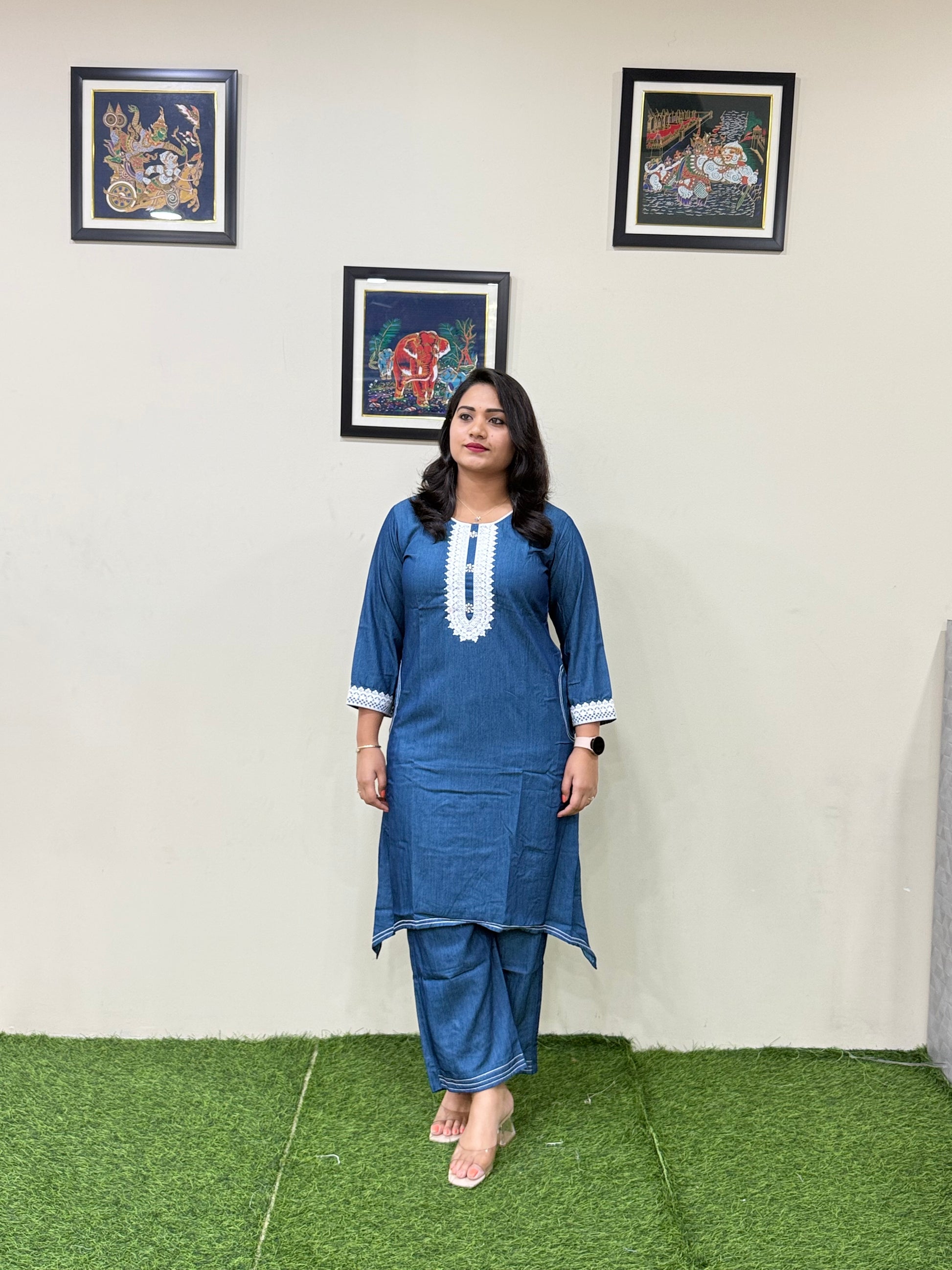 This elegant co-ord set from collection blends boutique-inspired design with everyday comfort. Crafted from breathable and durable premium fancy denim, the set includes a fish-cut top featuring dual side pockets, subtle thread work, and hand embellishments. The coordinated straight-cut pant complements the top, offering ease of movement and a refined look. Ideal for workwear, casual outings, or understated festive styling, this co-ord set is available in L to 3XL sizes. With a top length ranging from 41 to 45 inches and pant length of 39 inches, it ensures a flattering silhouette with thoughtful tailoring.